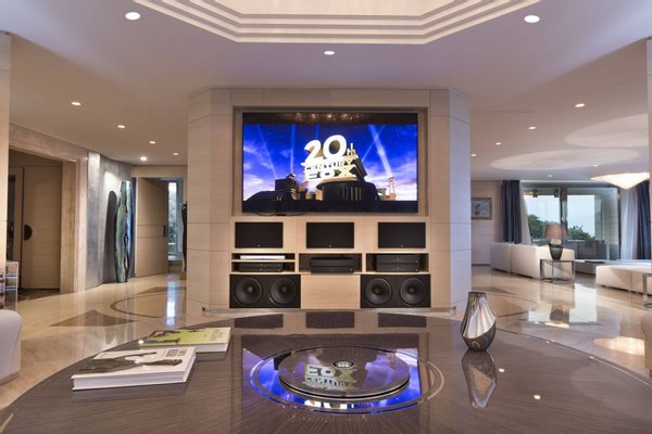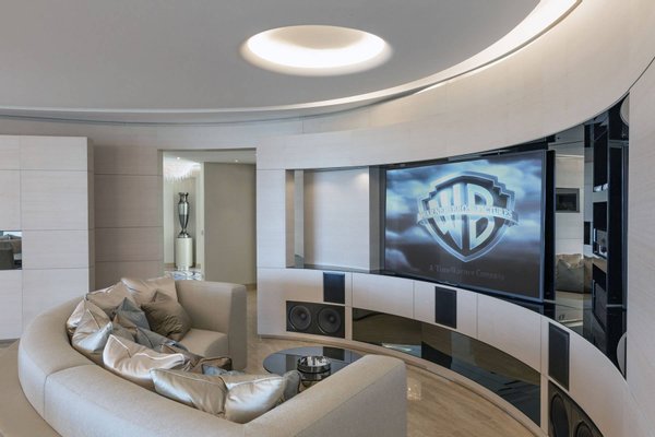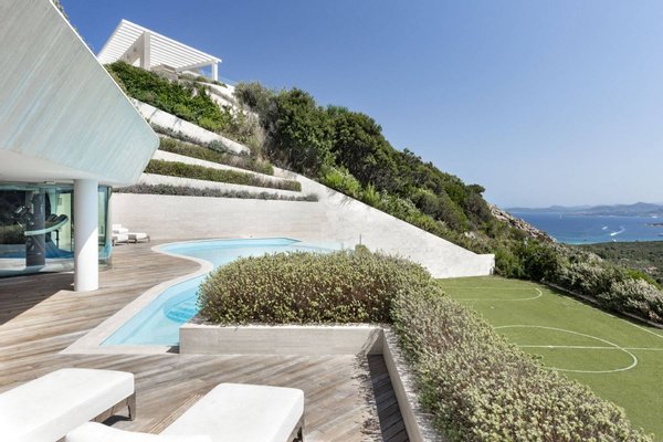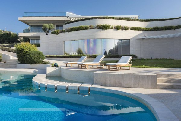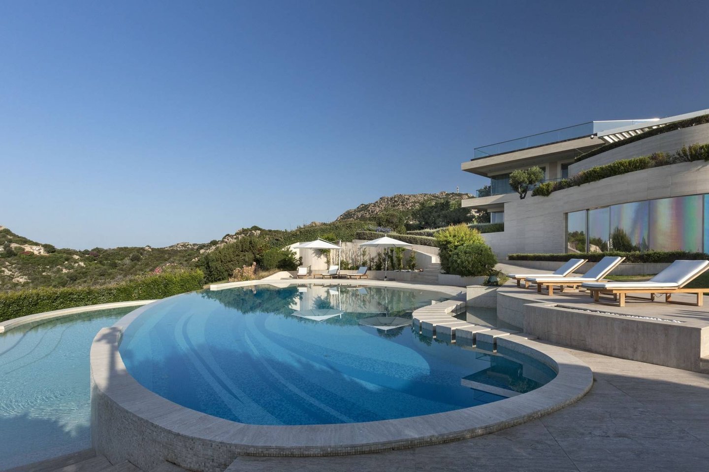 The main building, about 1000 square meters, includes a panoramic living room bordered by sinuous floor-to-ceiling windows, a professional kitchen, a home theatre room and various rooms dedicated to relaxation and personal care.