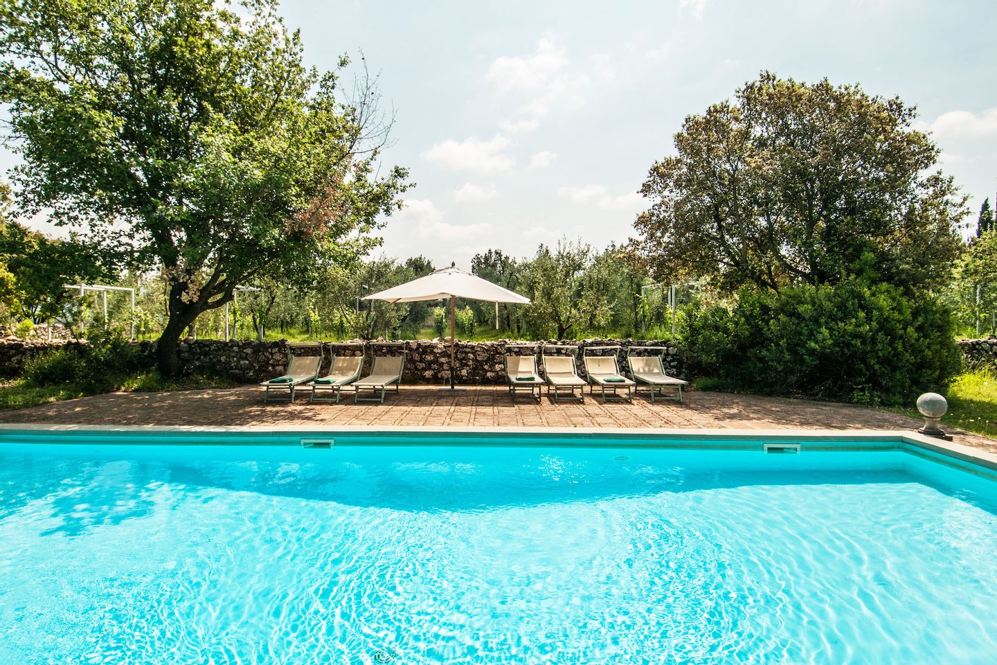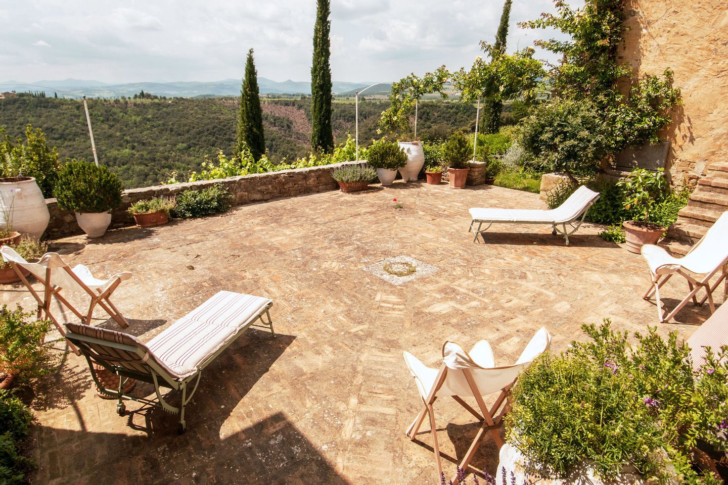 The villa can welcome up to ten guests and can accommodate an additional six guests (up to 16 guests total) with a detached dependance. The main villa includes five bedrooms, all with en-suite bathrooms. The guesthouse (which requires an additional reservation) offers an additional three double bedrooms for larger parties. The main house includes a charming, fully-equipped kitchen and dining room; a magnificent living room with vaulted ceilings, which opens onto a lovely terrace with vines, pots of flowers and extraordinary views of the countryside; an additional sitting room with a television, fireplace, and sofa-bed; and a covered dining terrace, also with wonderful views.