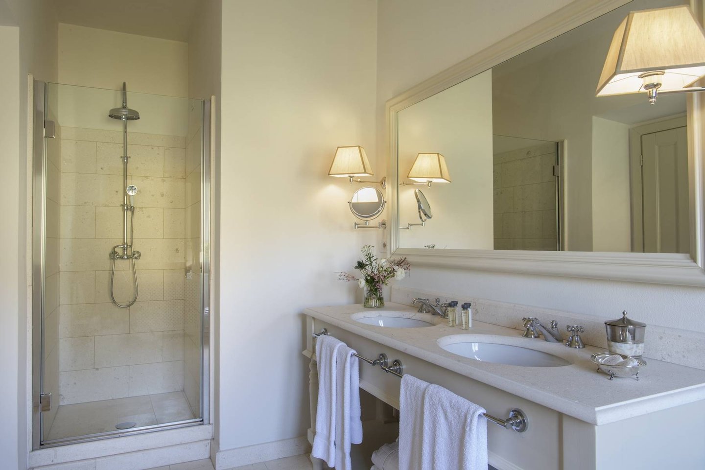 Villa Martin is elegantly furnished with warm colours and modern comforts and is surrounded by a fenced garden. On the ground floor two French doors open onto the dining room connected with the sitting room and the fully equipped kitchen. The Villa is composed of 5 double bedrooms, each with its own en-suite bathroom: one large double bedroom with walk-in closet and very large bathroom and shower is on the ground floor; 3 large double bedrooms with beautiful bathrooms with walk-in shower are on the first floor and one more double bedroom with amazing view is in the attic.