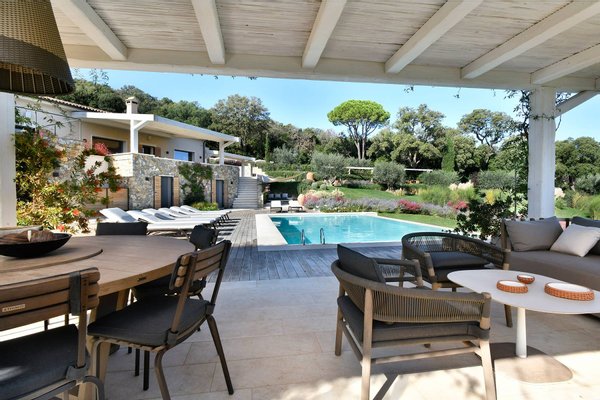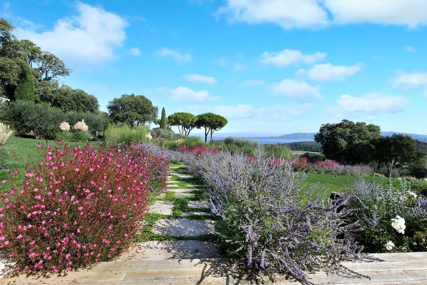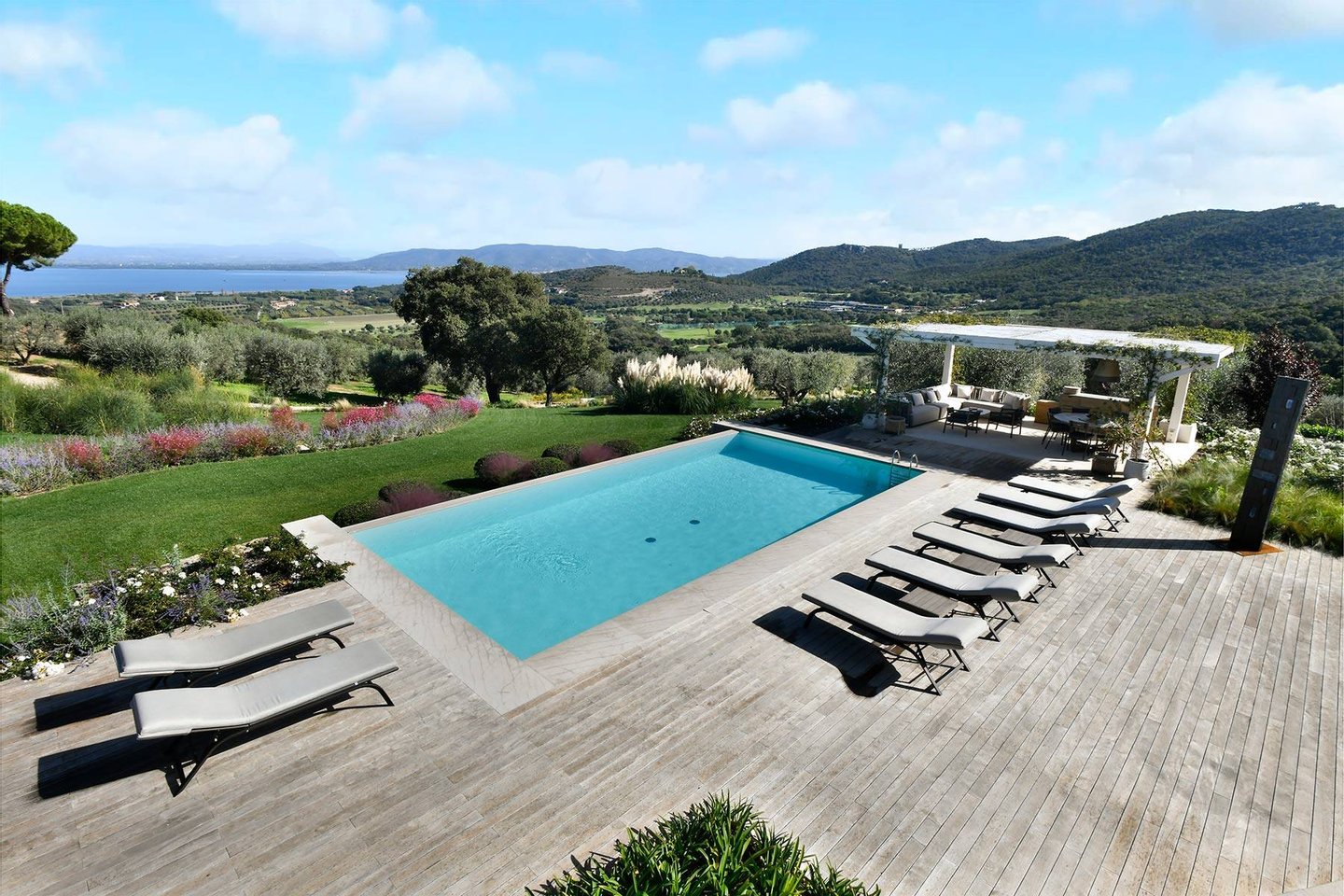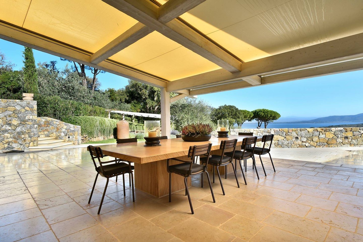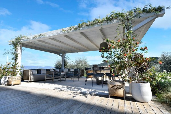 A large outdoor dining table under a pergola surrounded by lavender can seat up to 40 guests, making it perfect for convivial meals.
