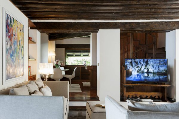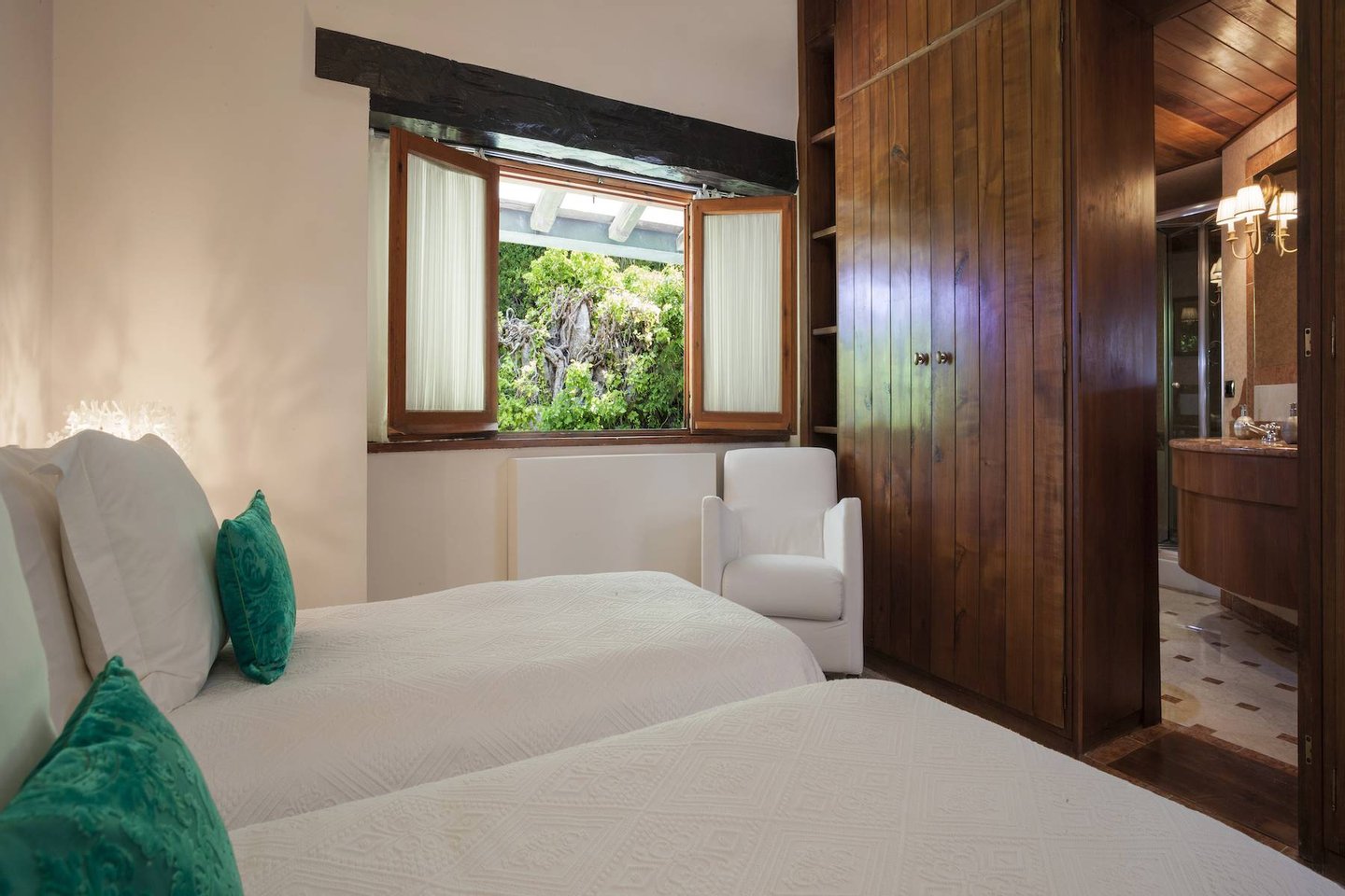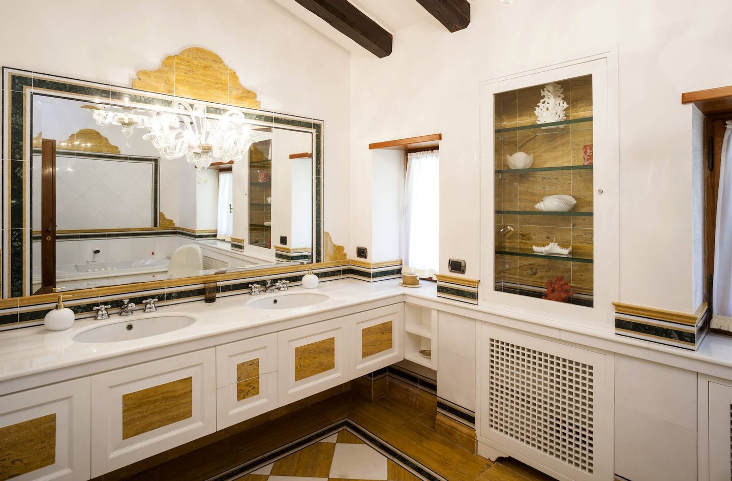On the ground floor, the large living area, accessed through French windows, is divided into different areas: a lounge area furnished in perfect Italian style, a TV area with comfortable sofas, and a cosy parlour for card games. On the same level there is the dining room with a second entrance hall, and the fully-equipped kitchen with access to the rear garden. Near the kitchen, there is a convenient laundry and the small double en-suite bedroom used by the staff.