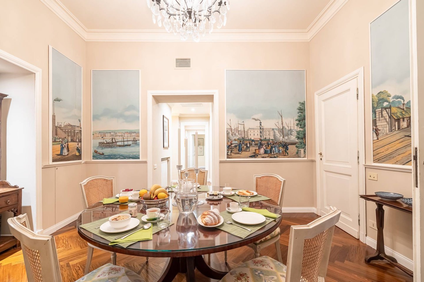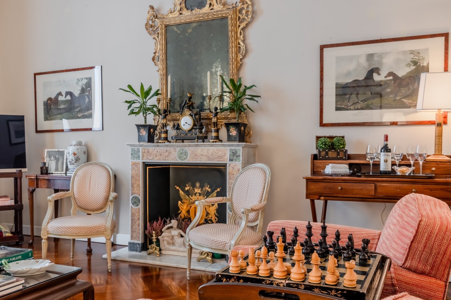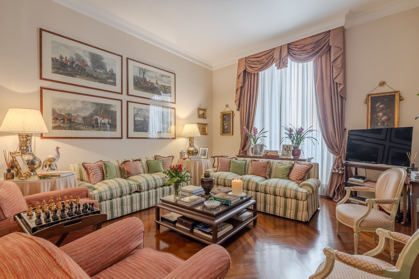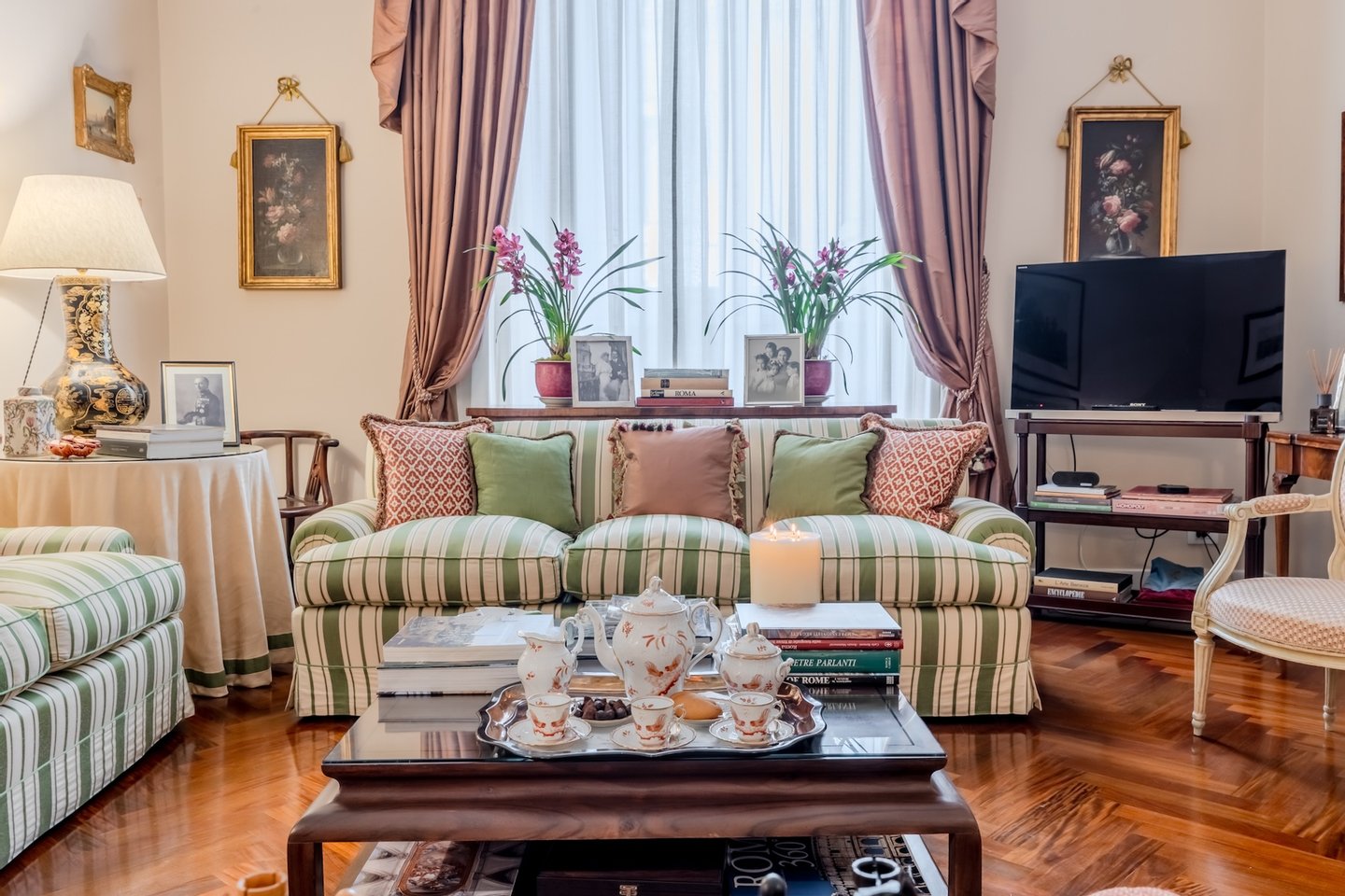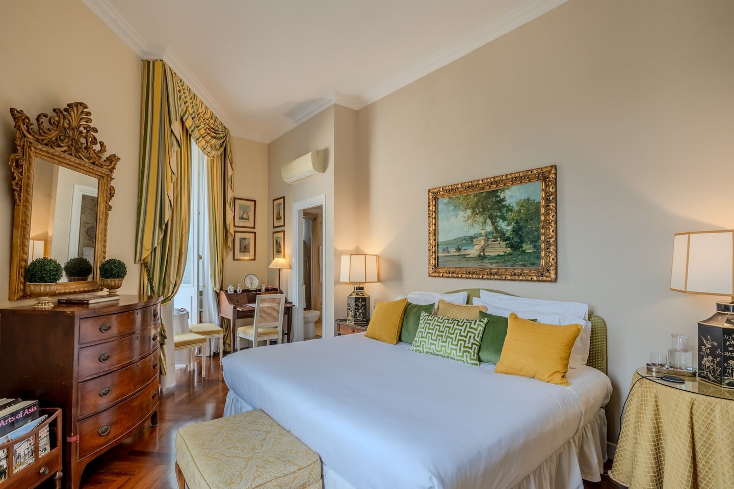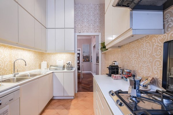 Furnished with attention to detail, it is characterized by a large living room with marble fireplace, a dining room decorated with historical appeal, a comfortable kitchen, two master bedrooms, one of which with an en-suite bathroom, both with amazing views of the Forum, an additional bathroom and a single bedroom also with an en-suite bathroom.