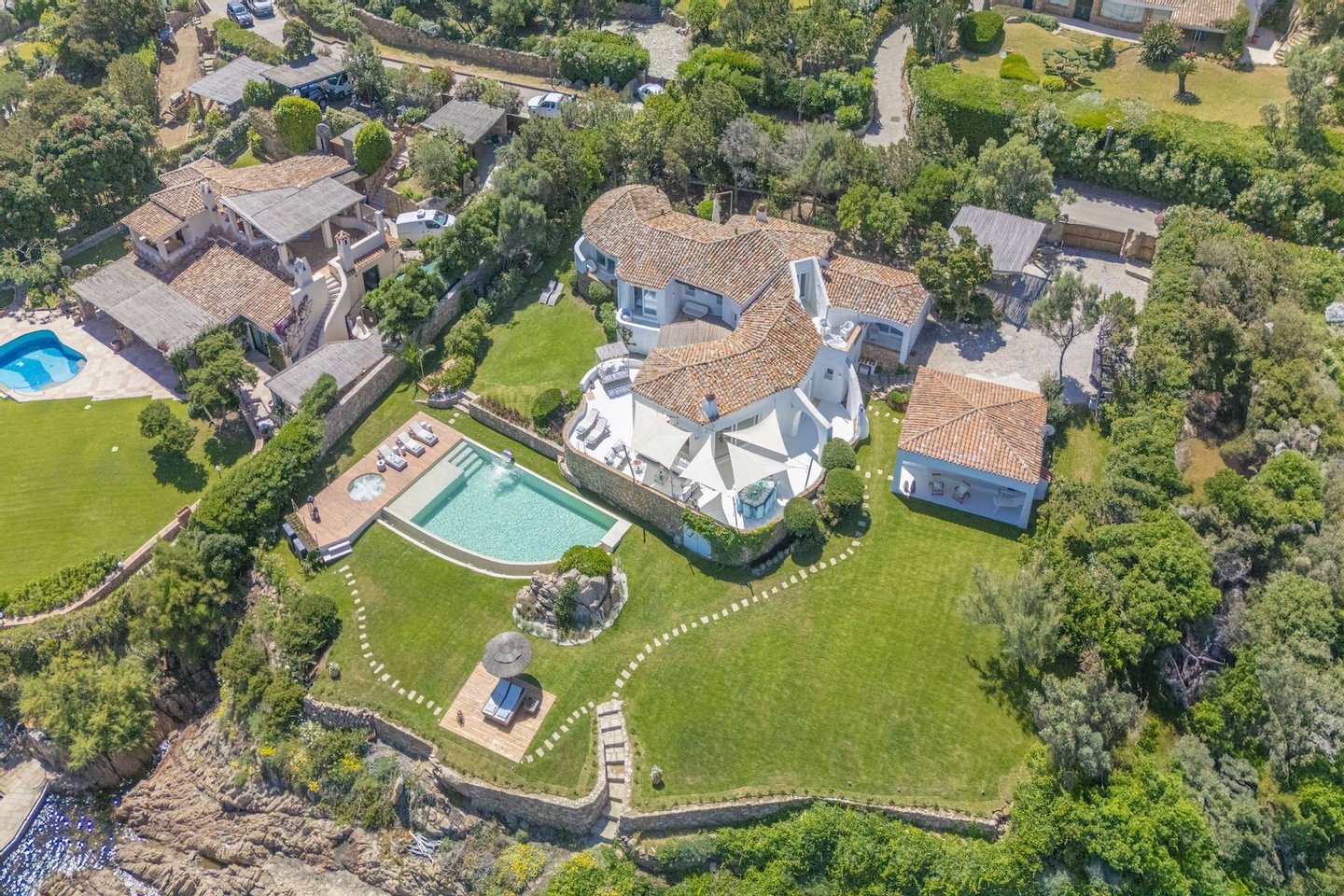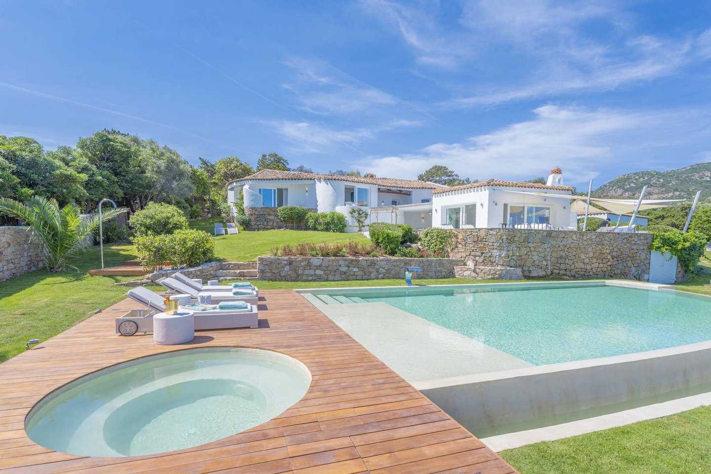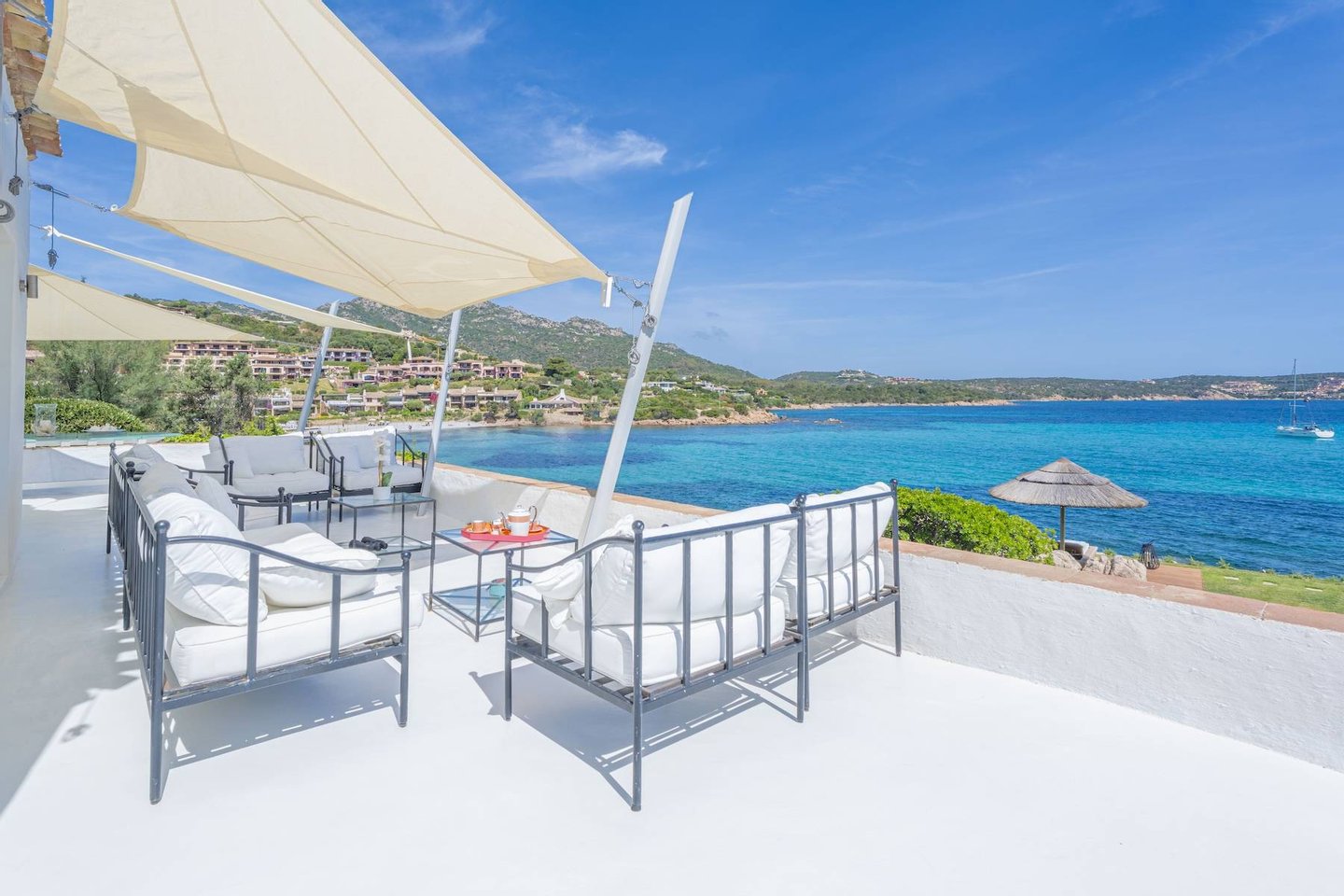 The outdoor spaces reflect the style and elegance of the interior and are divided into various relaxation areas: some discoveries closer to the sea, others sheltered by sail awnings or a typical straw umbrella; a barbecue area with dining area and an unmissable jacuzzi area by the sea complete the property.