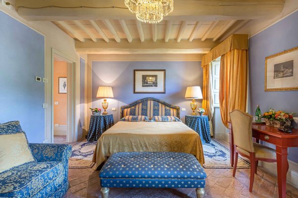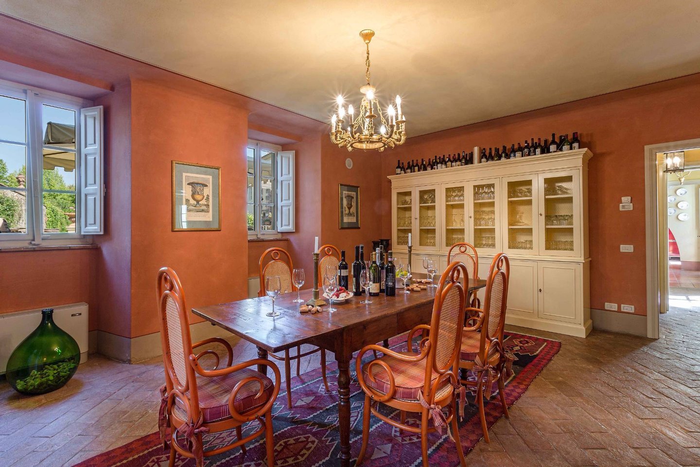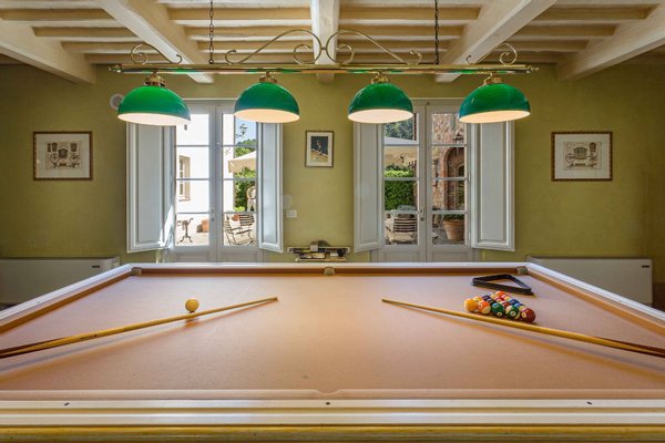 The estate harmonizes its historical, noble heritage with modern luxuries, creating a timeless, classic aesthetic. The common living areas include a wine library with private collection of Tuscan wines, a billiard and cards room, a music room with log fireplace and a domed ceiling, a grand banquet room, a large, fully-equipped Tuscan kitchen, several comfortable lounges and living rooms, and a private gym.