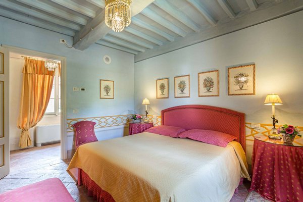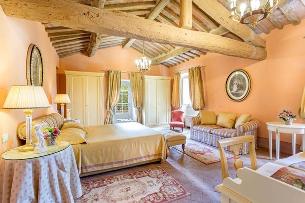 Villa Cardo features 12 individually decorated bedrooms, which can accommodate up to 24 guests. The bedrooms are characterized by features typical of Tuscan villas, such as terracotta floors and wood-beamed ceilings, providing a warm atmosphere.