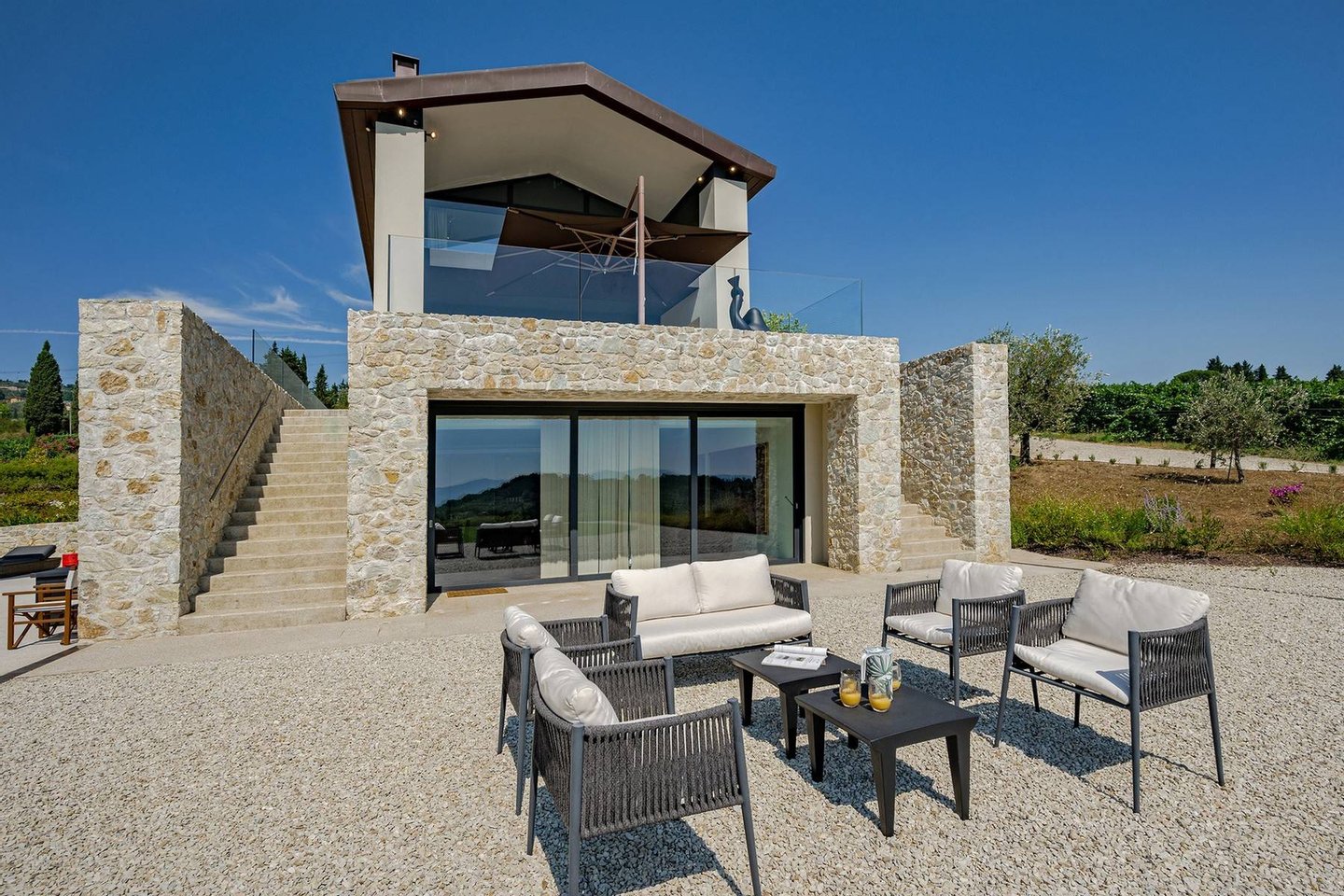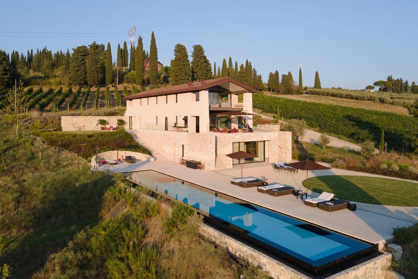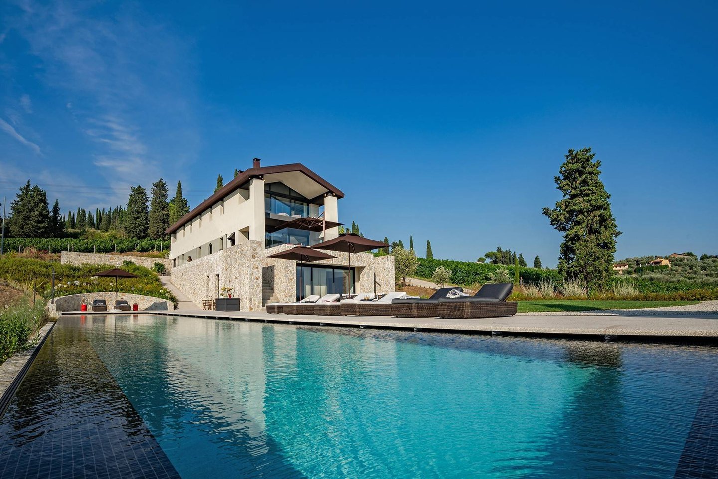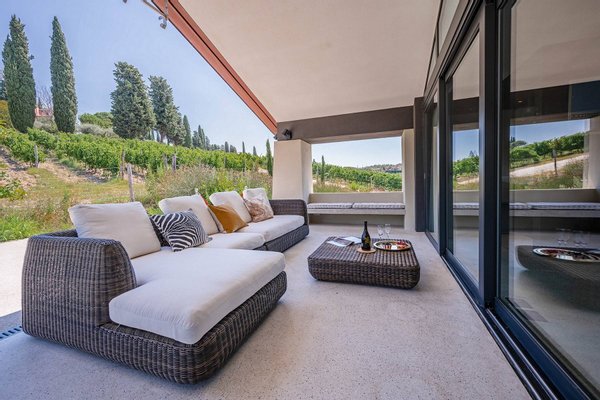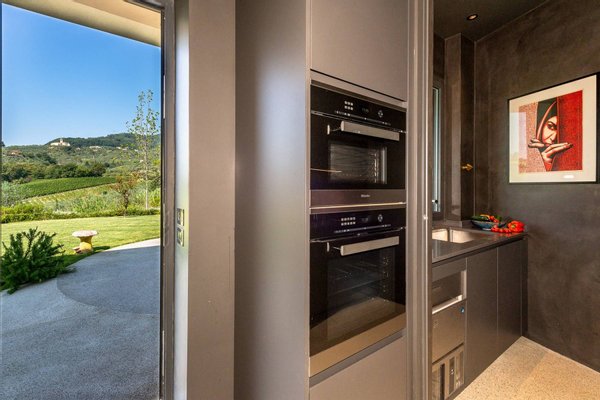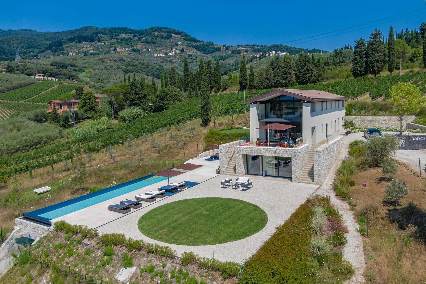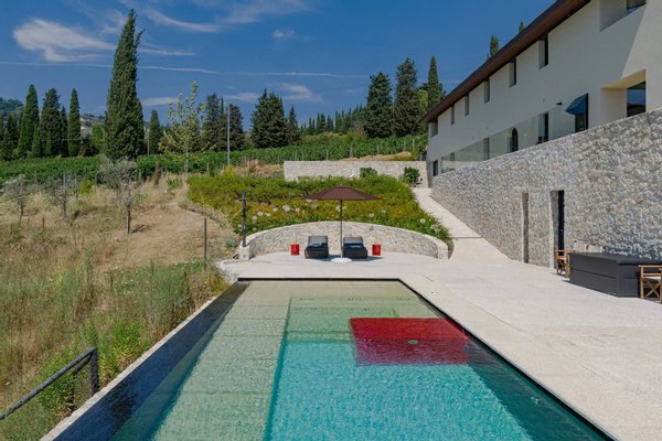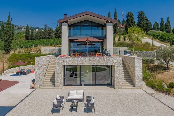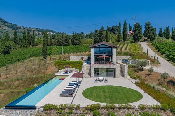 Surrounded by vineyards and olives groves, this strikingly beautiful villa was designed by a noted international architect and designer. Blended with a striking mix between old farm house and modern design featuring large open spaces, stunning views, an incredible 22 m infinity heated pool, a relaxing hydro massage area and beautiful spacious pool area surrounded by sun loungers, this villa offers the maximum of both comfort and modern luxury.