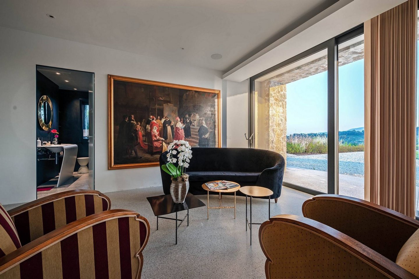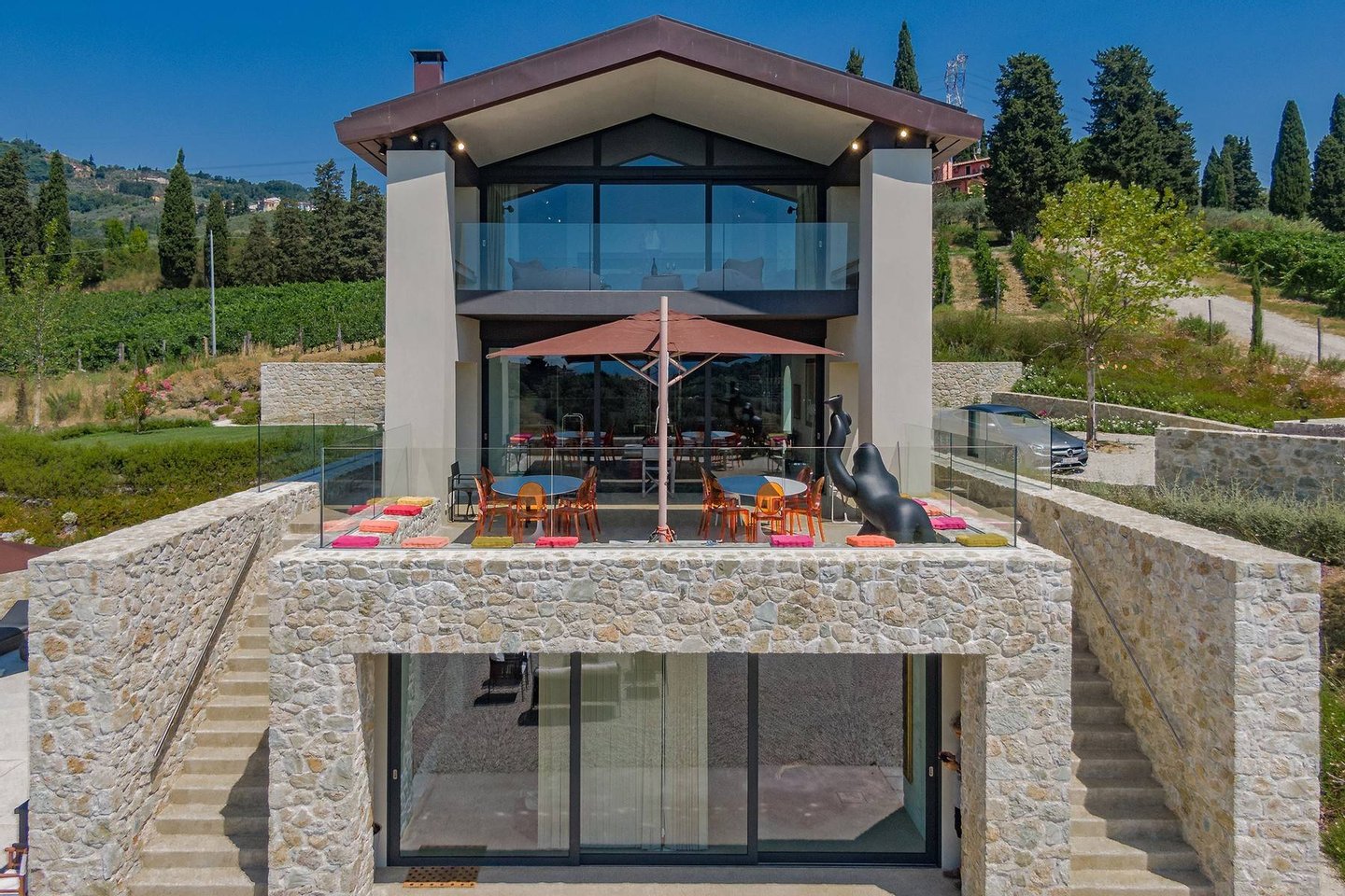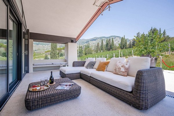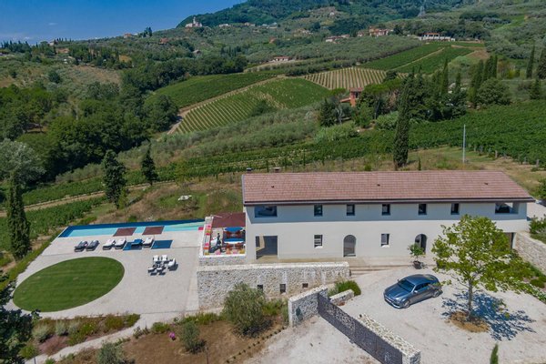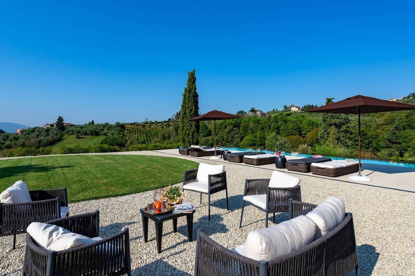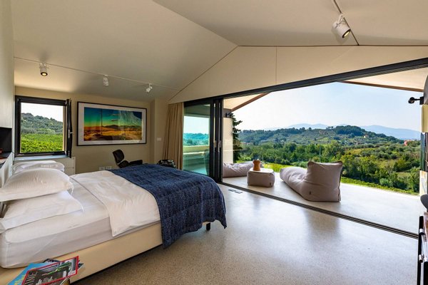 Surrounded by vineyards and olives groves, this strikingly beautiful villa was designed by a noted international architect and designer. Blended with a striking mix between old farm house and modern design featuring large open spaces, stunning views, an incredible 22 m infinity heated pool, a relaxing hydro massage area and beautiful spacious pool area surrounded by sun loungers, this villa offers the maximum of both comfort and modern luxury.