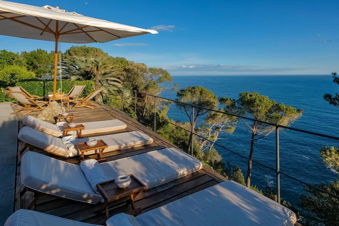 The property can accommodate up to ten guests with its five charming air conditioned bedrooms. It features four different outdoor dining areas, including a pretty vine-covered gazebo on a plateau, which offers unparalleled views of the sea. The saltwater swimming pool has a bar carved out of the rock, perfect for serving the perfect cocktail at the right temperature. The property is accessed through a tunnel in the hill and an elevator that takes you almost to the house.