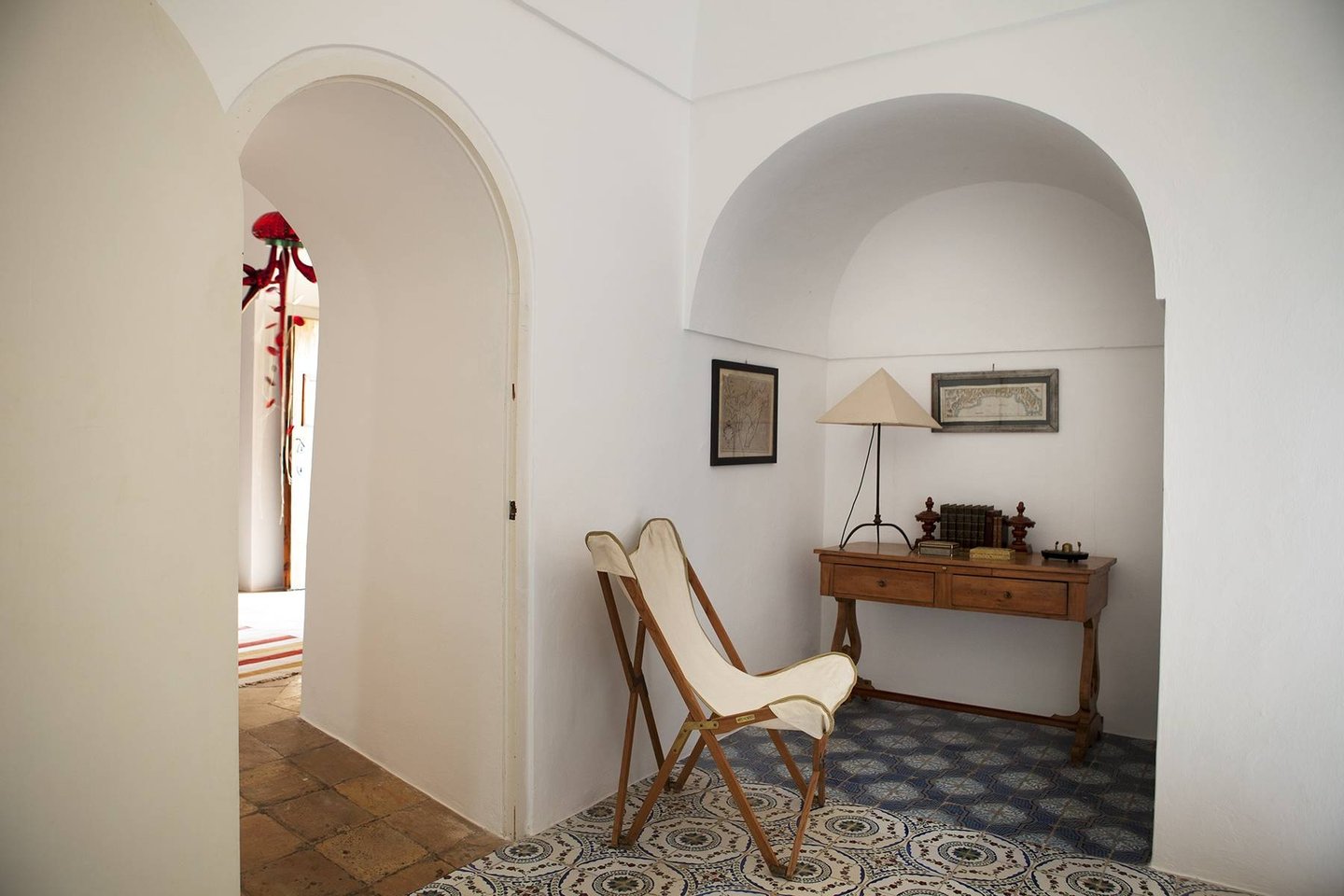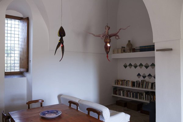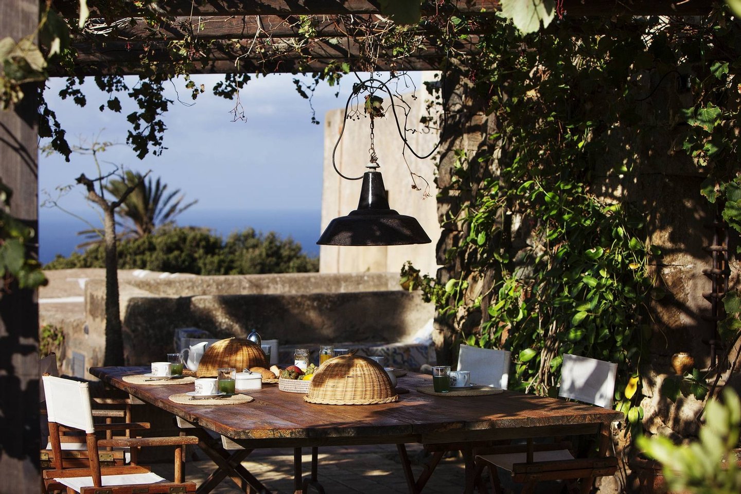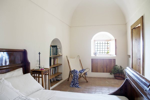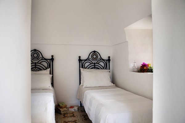 Antique and modern furniture and light sculptures of contemporary art, decorate large halls and small intimate alcoves. The estate, with its elegant and welcoming decor, can host up to eight guests. It features two separate buildings (dammusi). The first building consists of common areas, including the welcoming living room, the dining room with a table that seats 12, a reading alcove, and a fully-equipped kitchen. The other dammuso features the living quarters, consisting of four double bedrooms, all furnished with antique furniture and ceiling fans.
