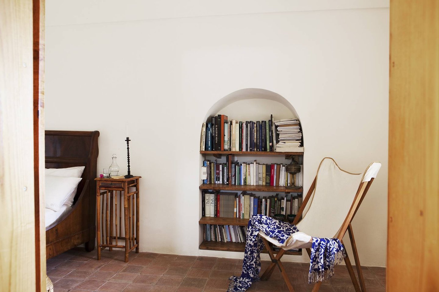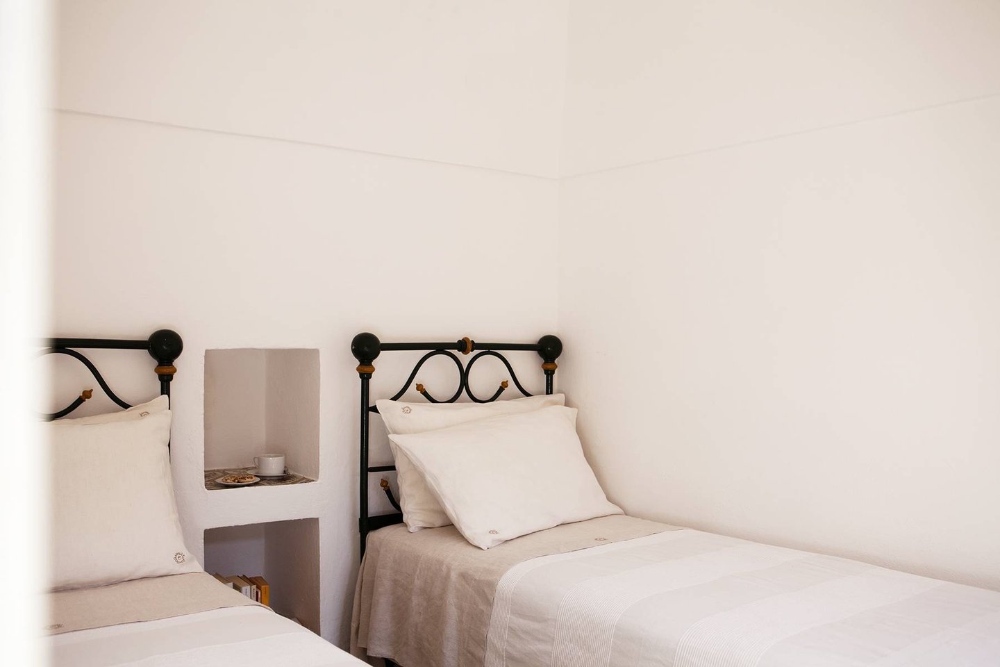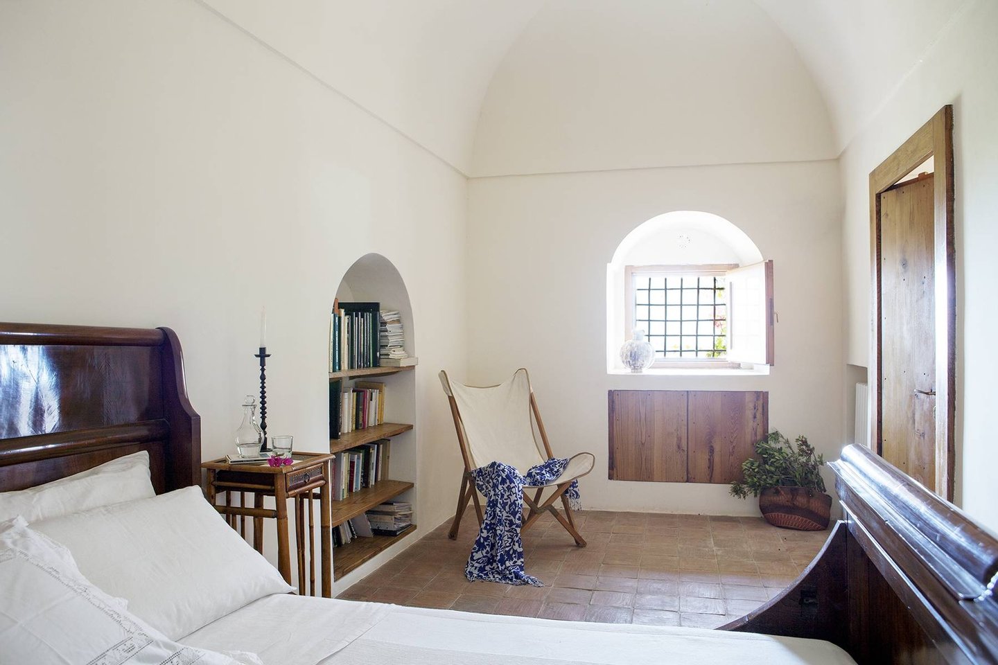 Antique and modern furniture and light sculptures of contemporary art, decorate large halls and small intimate alcoves. The estate, with its elegant and welcoming decor, can host up to eight guests. It features two separate buildings (dammusi). The first building consists of common areas, including the welcoming living room, the dining room with a table that seats 12, a reading alcove, and a fully-equipped kitchen. The other dammuso features the living quarters, consisting of four double bedrooms, all furnished with antique furniture and ceiling fans.