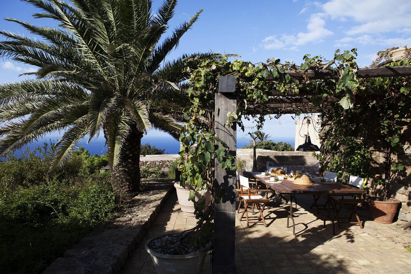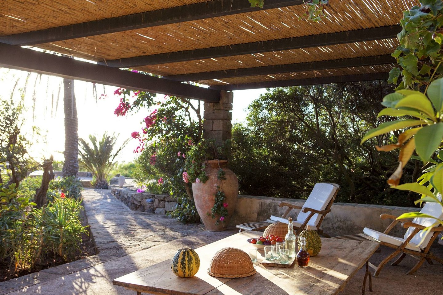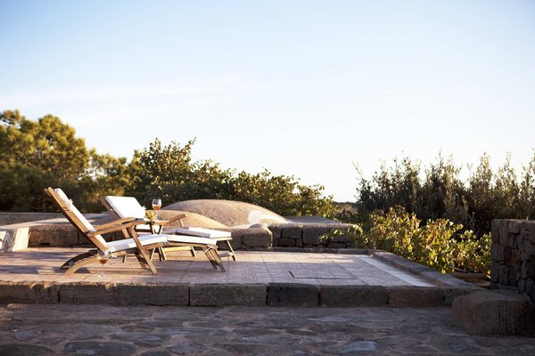 This property is divided into two dammuso,the traditional and historical house of on the Island of Pantelleria. The estate features a comfortable outdoor lounge area around the pool area where guests can unwind under the pergola, comfortable lounge chairs which overlook the garden of hibiscus, and a large pool, tiled with majolica. The patios and the gardens preserve pieces retained from the ancient farming traditions of the estate, blending the structure's past with the present.
