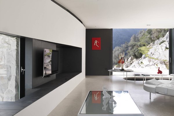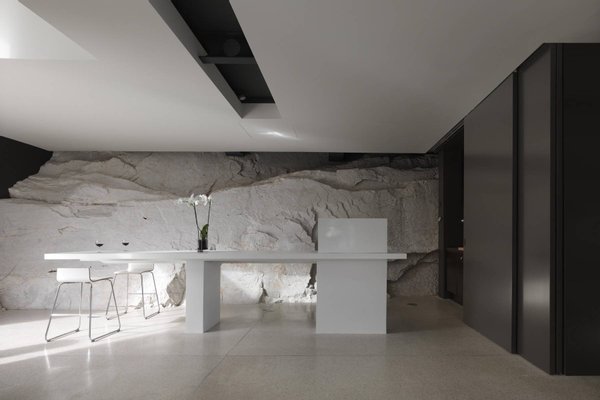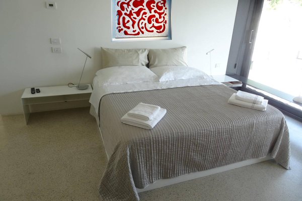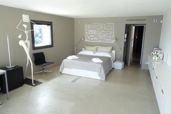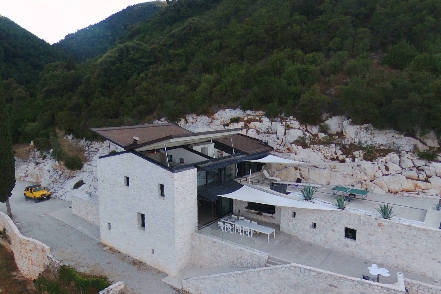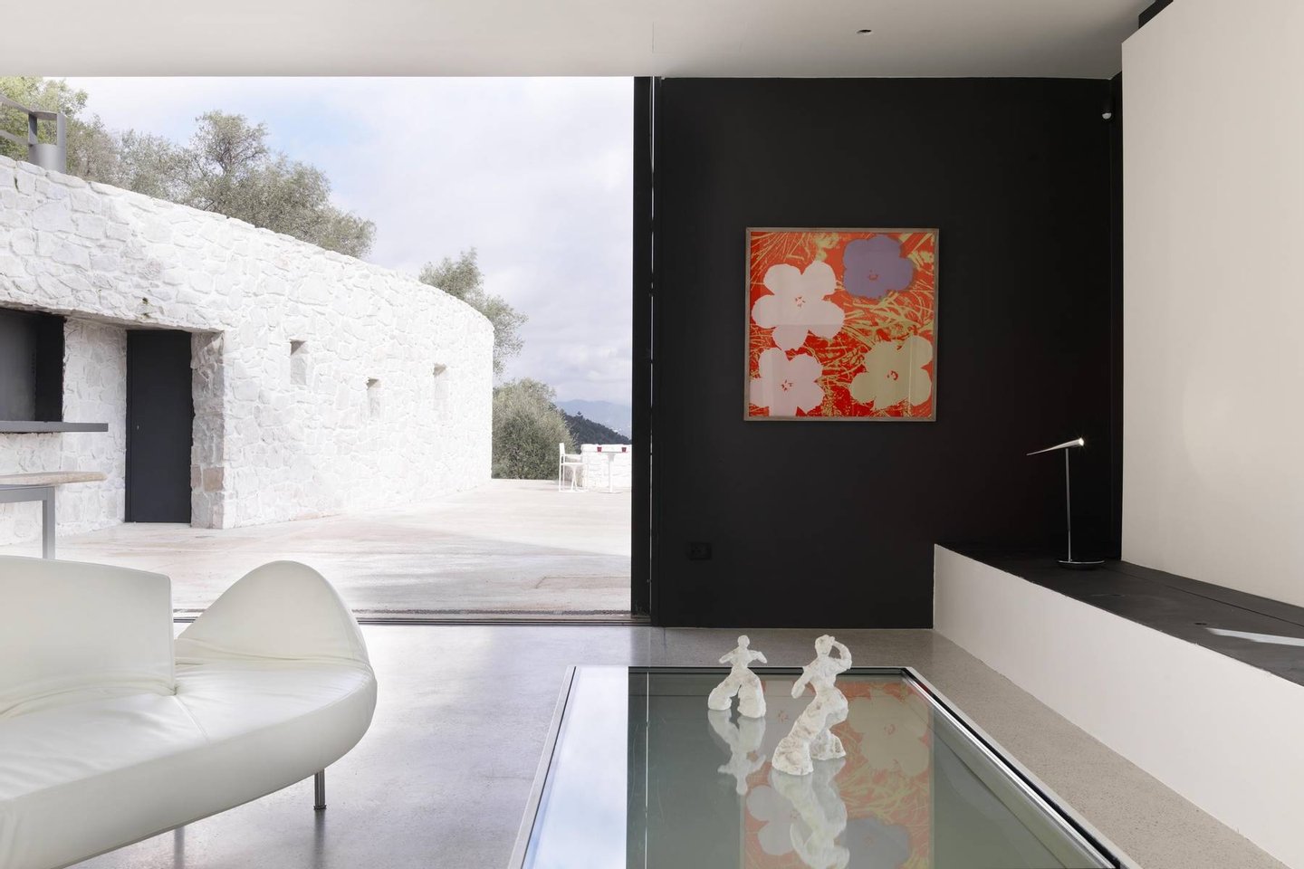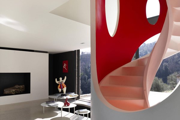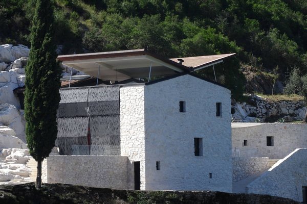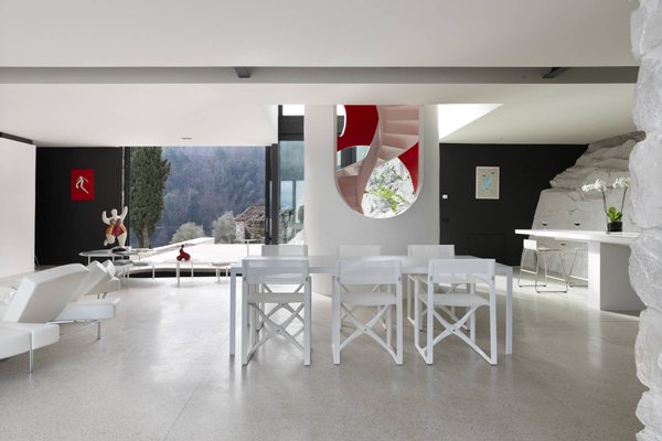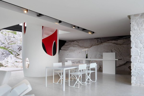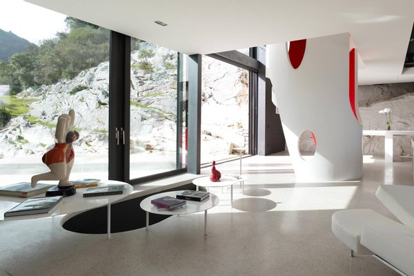 This estate is the result of design and environmental consciousness, having been constructed using ecological techniques and local materials. Though juxtaposing, it blends gorgeously with its surroundings. The design of the shutters of the house were the inspiration for an elaborate bowl, found in the house as a centre piece for the table in the lounge area, designed for the Alessi 2016 Collection. The furniture inside the house, like the sofas, the central table on the ground floor, and the marble seats located on the outdoor terrace, are all unique pieces of designer art.