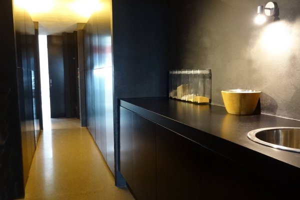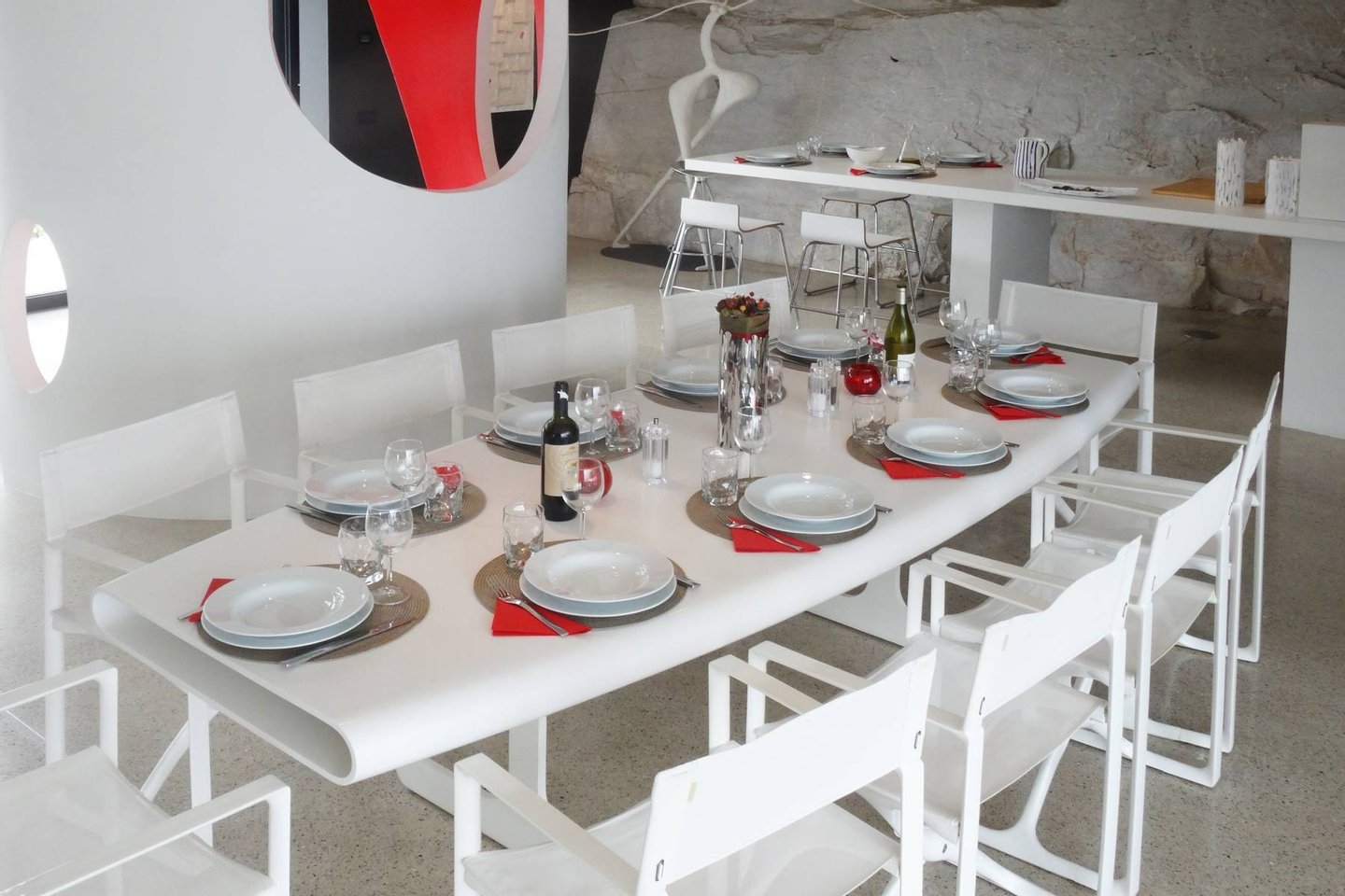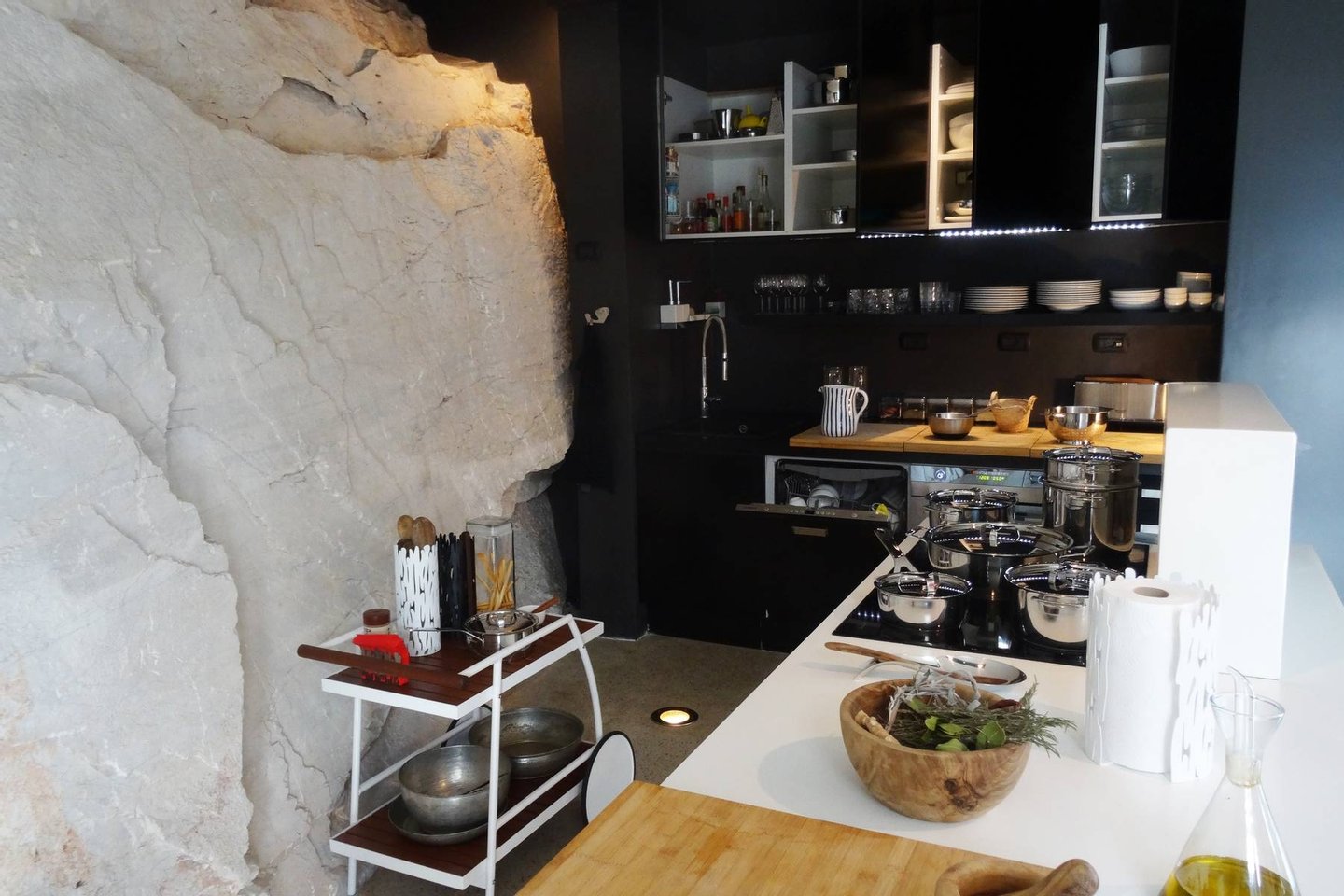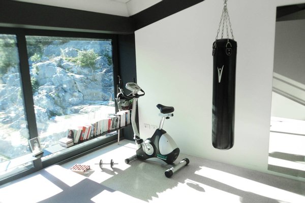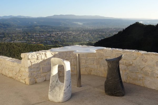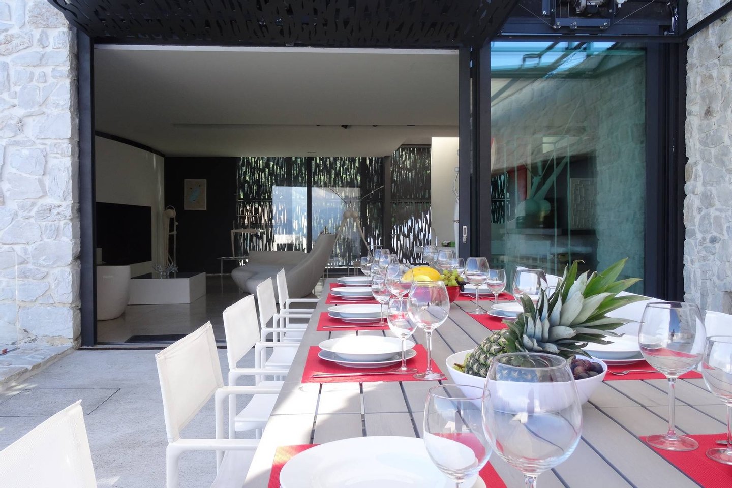 This estate is the result of design and environmental consciousness, having been constructed using ecological techniques and local materials. Though juxtaposing, it blends gorgeously with its surroundings. The design of the shutters of the house were the inspiration for an elaborate bowl, found in the house as a centre piece for the table in the lounge area, designed for the Alessi 2016 Collection. The furniture inside the house, like the sofas, the central table on the ground floor, and the marble seats located on the outdoor terrace, are all unique pieces of designer art.