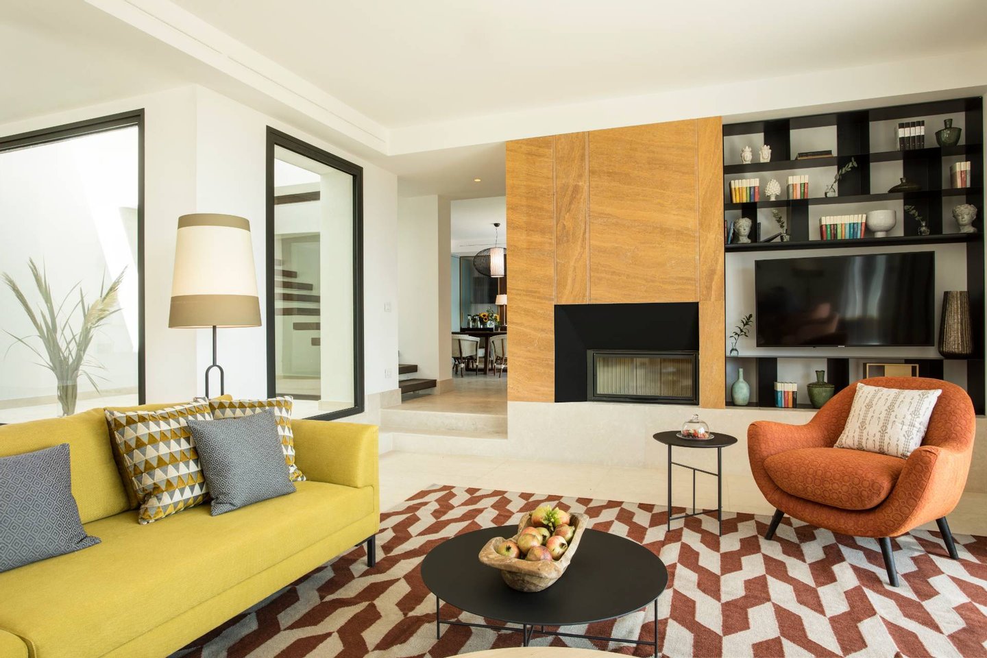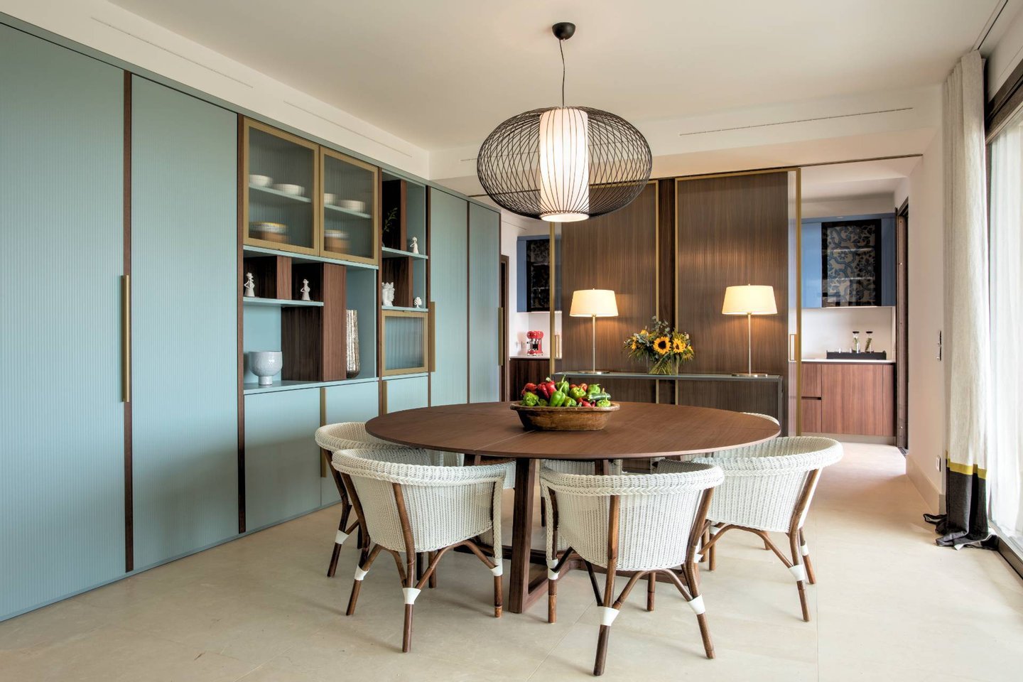 Inside, the ground floor includes a spacious study, living area, dining room, and kitchen. At the center, there's an atrium filled with bamboo, enhancing the natural light flooding in from floor-to-ceiling windows overlooking the sea, providing yet another opportunity to immerse in the surrounding landscape.