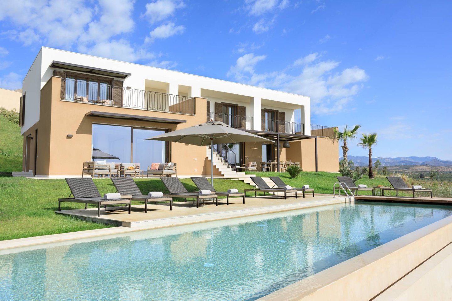 Situated in a prominent location facing the sea with uninterrupted views of the Mediterranean, Villa Reef rises among the gentle slopes of the sunny coast and is spread over two levels, each overlooking a large private pool and the southern Sicilian