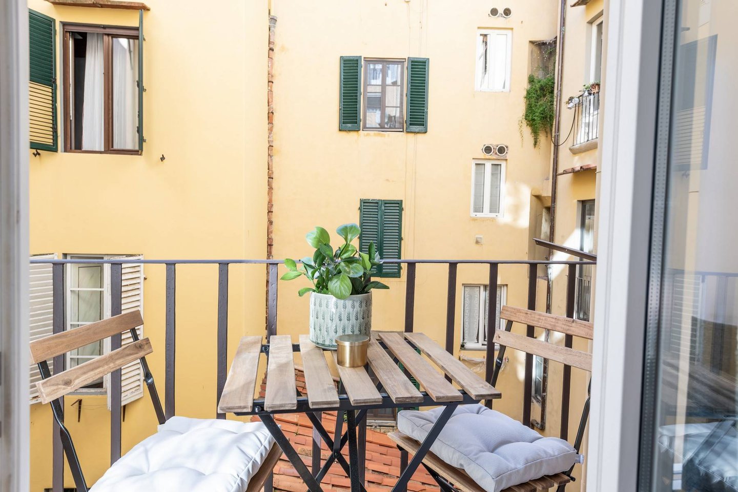 One bedroom with five star luxury hotel quality bedding, one complete bathroom with a wonderful shower and an additional guest bathroom without shower. A comfortable living room with 50-inch smart TV and a unique kitchen/dining room with a breath-taking view of Palazzo Pitti. From the bedroom you can access the beautiful balcony overlooking a typical Florentine courtyard.