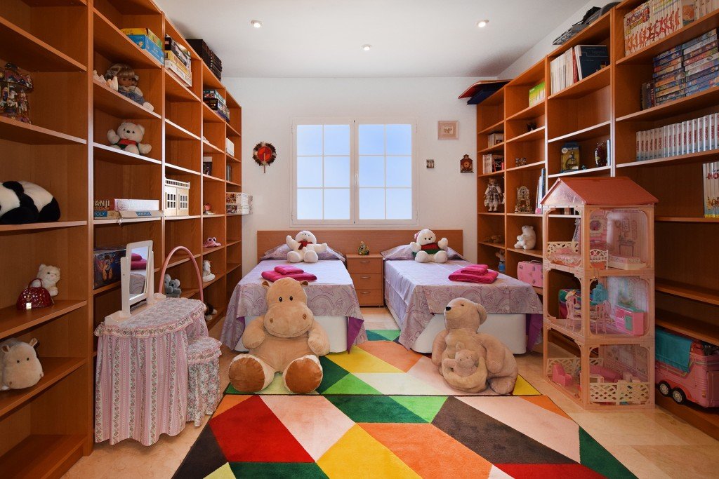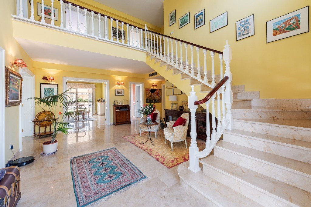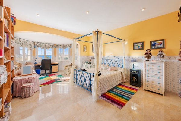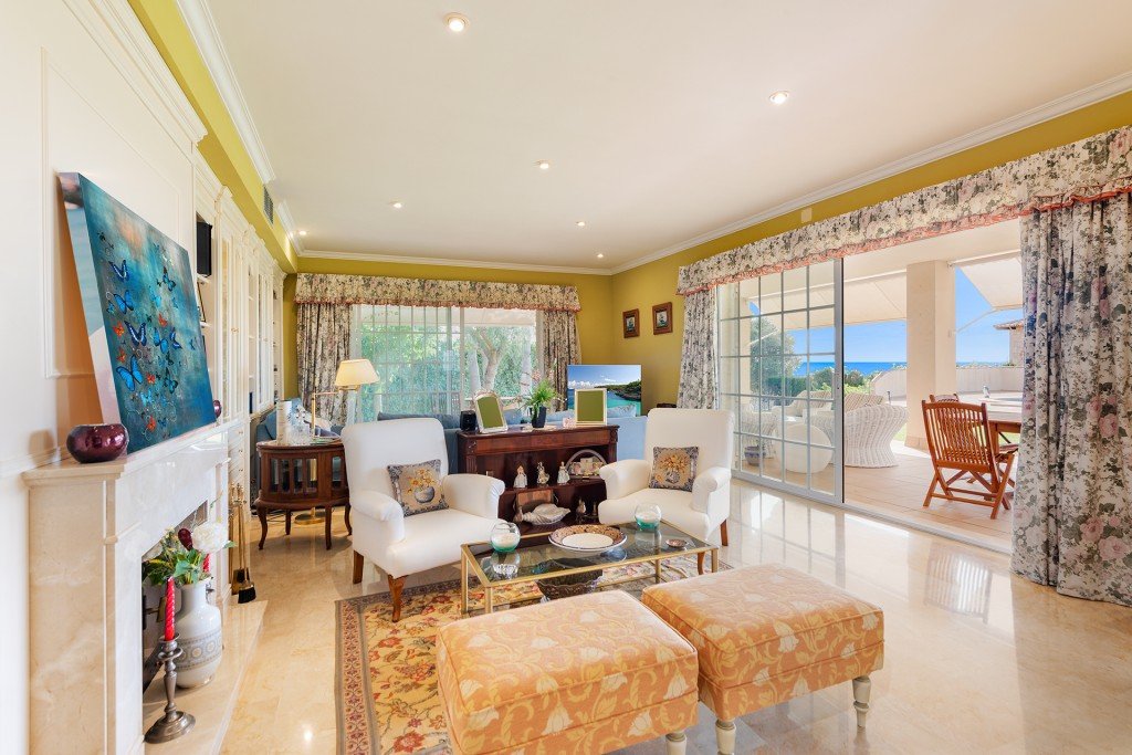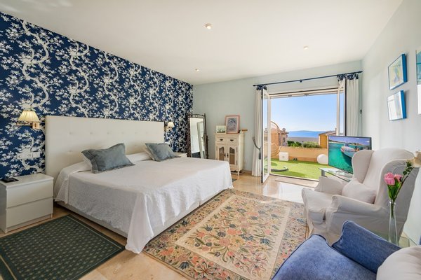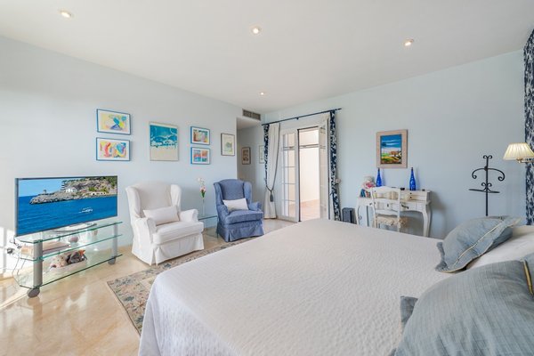 In der ersten Etage befinden sich drei Schlafzimmer und drei Bäder mit eigenem Bad, darunter das Hauptschlafzimmer mit Ankleideraum und einer privaten Terrasse mit Blick auf das Meer.