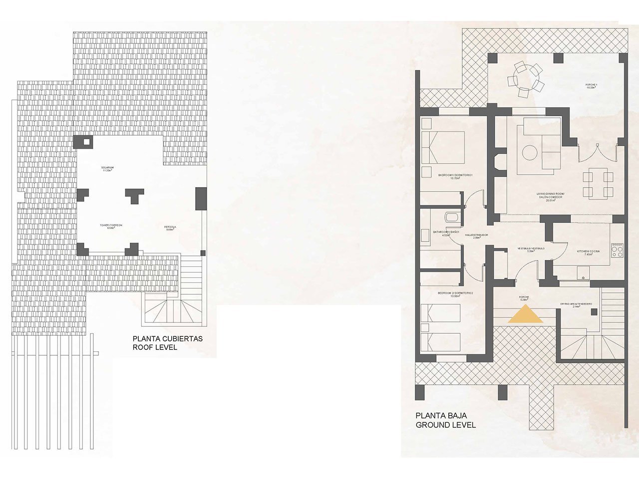 In dieser Anlage gibt es Reihenhäuser und Villen mit 2 oder 3 Schlafzimmern und 1 oder 2 Bädern und viele Wohneinheiten verfügen über Dachterrassen, von denen man einen sehr schönen Ausblick genießen kann. Und es sind zwei Gemeinschaftspools vorhanden.