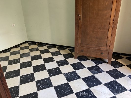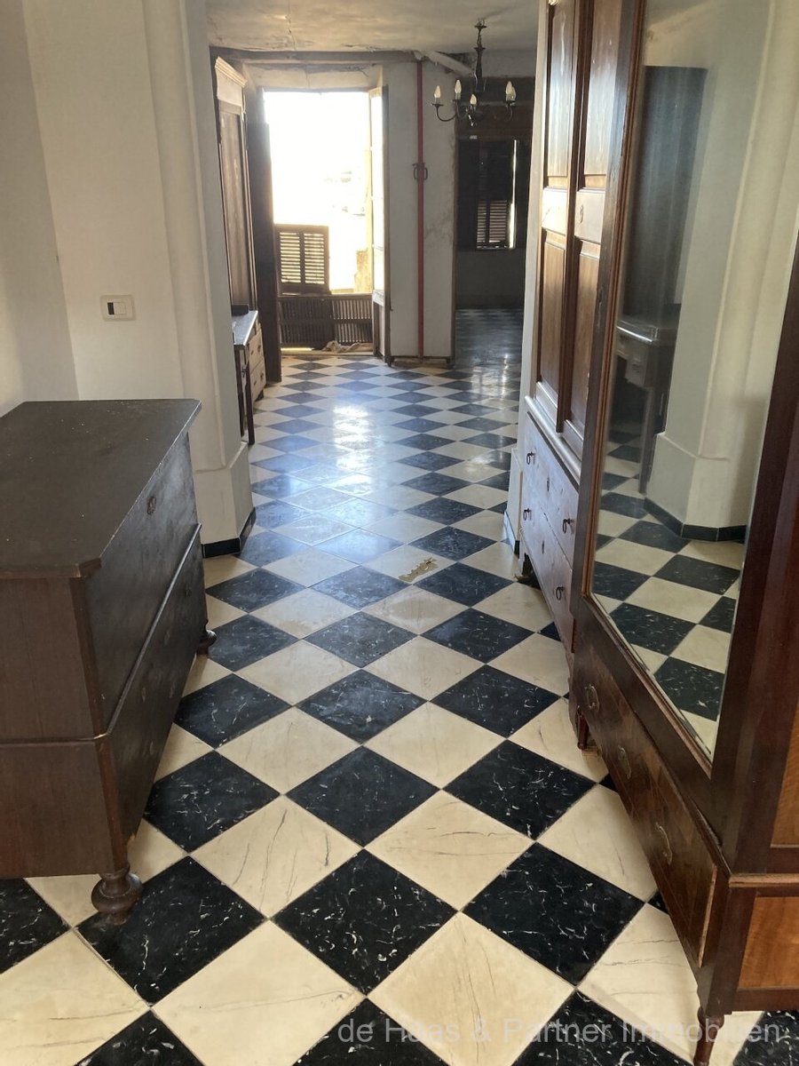 Erdgeschoss: große Eingangshalle ( 40m²), von der links ein kleines Zimmer und im weiteren Verlauf des Flurs die Küche mit Kamin und das Esszimmer mit Zugang zum Patio gelegen sind.