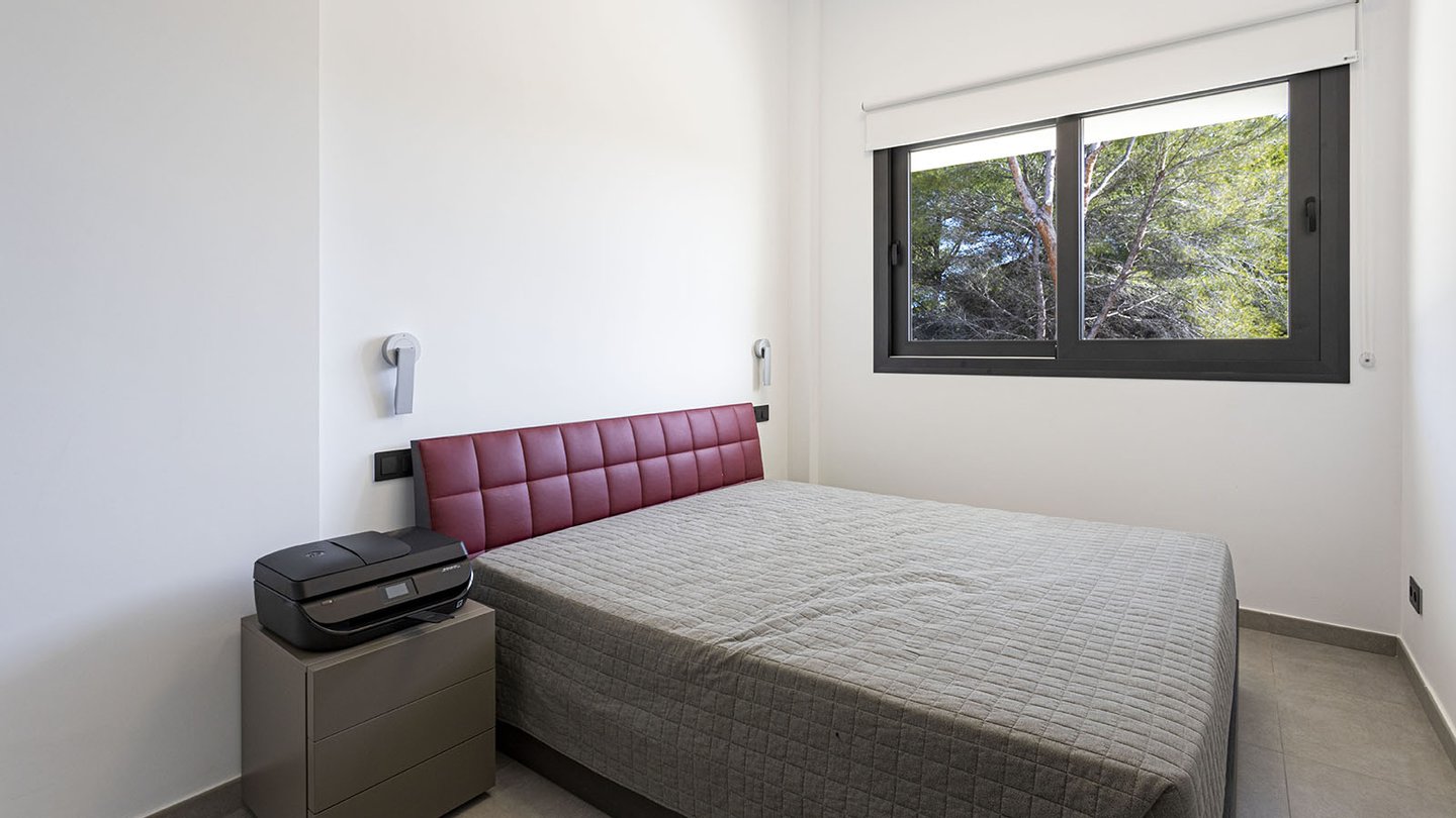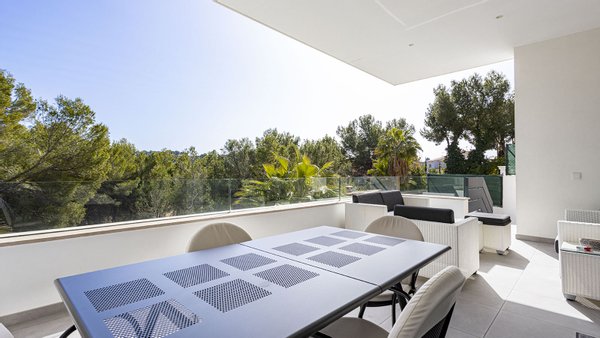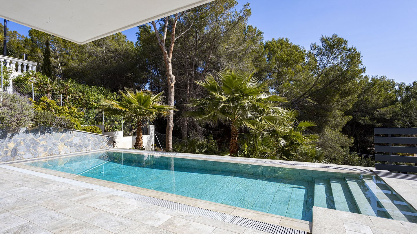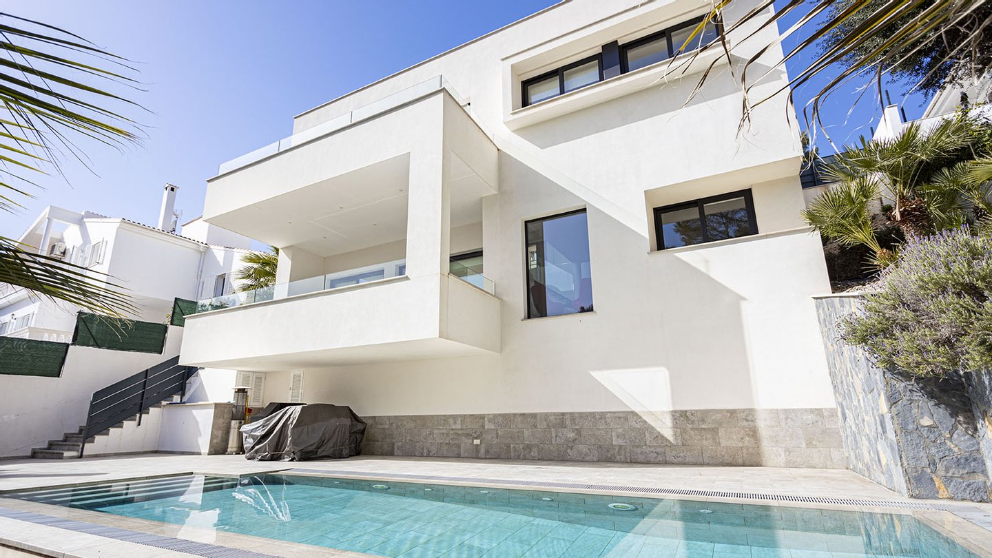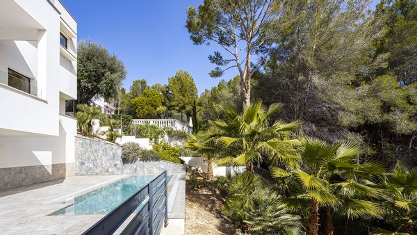 Moderne Villa in ruhiger Wohngegend mit Blick in die begrünte Umgebung. Sie befindet sich im Südwesten der traumhaften Insel Mallorca.Diese lichtdurchflutete Villa wurde im Jahr 2016 erbaut und zeichnet sich aus durch das moderne Design, sowie die offene Raumgestaltung. Es verfügt über eine Grundstücksfläche von ca. 725 m2 und eine bebaute Fläche von ca. 410 m2, die sich auf 2 Etagen verteilt. Insgesamt werden 4 Schlafzimmer, 3 Bäder (2 davon en suite), eine mit Elektrogeräten ausgestattete Einbauküche, ein Abstellraum und ein Hauswirtschaftsraum geboten. Die Mastersuite verfügt über eine Ankleide, Bad en suite, sowie ein Zugang zum Balkon. Hervorzuheben sind die geschmackvoll verwendeten Materialien und die italienischen Designermöbel. Weitere Ausstattungsmerkmale sind: warm/kalt Klimaanlage, Fußbodenheizung, Porzellan-Fliesen, Bose Soundsystem, doppelverglaste Aluminiumfenster mit Rollläden, Einbauschränke, Solaranlage, 1 Parkplatz und vieles mehr. Der schöne Pool, Sonnenterrassen und Barbecue geben der Immobilie ein mediterranes Flair.Costa de la Calma ist eine ruhige Villenwohngegend mit schönen Buchten. Zwischen Santa Ponsa und Paguera gelegen, erreicht man beide Orte mit vielfältigen Einkaufsmöglichkeiten und tollen Freizeitmöglichkeiten in Kürze. Die kulturreiche Inselhauptstadt Palma de Mallorca ist über die Autobahn in ca. 20 Minuten erreichbar, der internationale Flughafen in ca. 30 Minuten mit dem PKW.Immobilien Mallorca wie diese fantastische Villa wird Ihnen angeboten von Ihrem führenden Immobilienmakler Mallorca, Casa Nova Properties in Santa Ponsa. Für den Käufer entsteht keine Vermittlungsprovision.