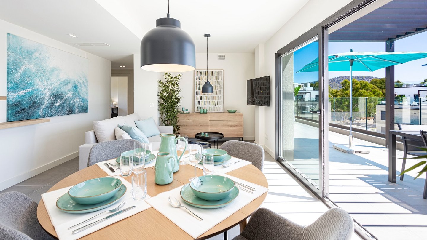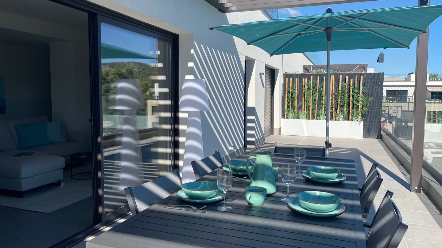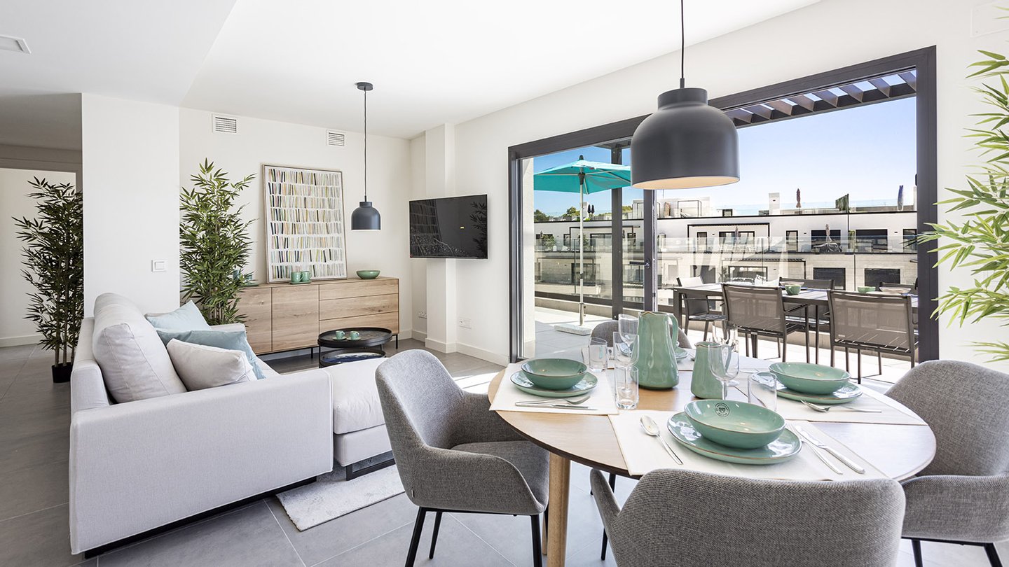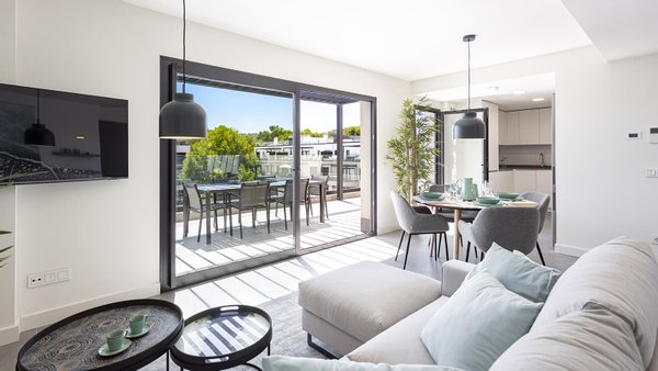 - Erstbezug - in Santa Ponsa im Südwesten der Sonneninsel in Laufnähe zum Sandstrand.Diese charmante Luxusimmobilie verteilt sich wie folgt: großzügiger Wohn- Essbereich und eine offene Einbauküche mit Marken-Elektrogeräten. Es gibt 3 Schlafzimmer, 2 Bäder (eines davon en suite), sowie einen Hauswirtschaftsraum. Vom Wohnbereich haben Sie Zugang zu einer weitläufigen ca. 51 m2 großen, offenen Terrasse, welche zum Entspannen einlädt. Das Highlight ist die ca. 102 m2 große Dachterrasse, die man über eine innenliegende Treppe erreicht. Hier gibt es einen privaten Pool mit einem unvergesslichen Blick auf das majestätische Tramuntana Gebirge und die Umgebung. Dieses sensationelle Penthaus lässt keine Wünsche offen und besticht mit der besten Bauqualität und Ausstattung. Die hochwertigen Ausstattungsmerkmale sind: Klimaanlage warm/kalt über Wärmepumpe, Fußbodenheizung (Gszentralheizung), doppelt verglaste Aluminiumfenster, elektrische Rollläden, Fliesenboden, Einbauschränke, Domotik-/Bussystem, Satellitenfernsehanschluß und vieles mehr. Die Neubauanlage bietet einen wunderbaren Gemeinschaftspool umrandet von Sonnenterrassen, einen Kinderspielplatz, sowie einen Fitnessbereich und vervollständigt somit dieses einzigartige Angebot. Dieses Apartment wird komplett möbliert und dekoriert angeboten.Santa Ponsa gehört zur Gemeinde Calvia und ist einer der beliebtesten Ferienorte in dieser Region. Dank der ganzjährigen Infrastruktur ist Santa Ponsa auch sehr als Dauerwohnsitz gefragt. In wenigen Minuten erreicht man das Ortszentrum mit vielen Geschäften, internationale Bars und Restaurants. Verschiedene Sandstrände, Golfplätze und Yachthäfen sind in unmittelbarer Nähe. Die schöne Inselhauptstadt Palma erreichen Sie in nur 20 Autominuten und der internationale Flughafen liegt nur 30 Minuten mit dem PKW entfernt. Immobilien auf Mallorca sind eine werthaltige Investition in die Zukunft. Diese Immobilie wird Ihnen präsentiert von Ihrem kompetenten Immobilienmakler in Santa Ponsa, Casa Nova Properties.