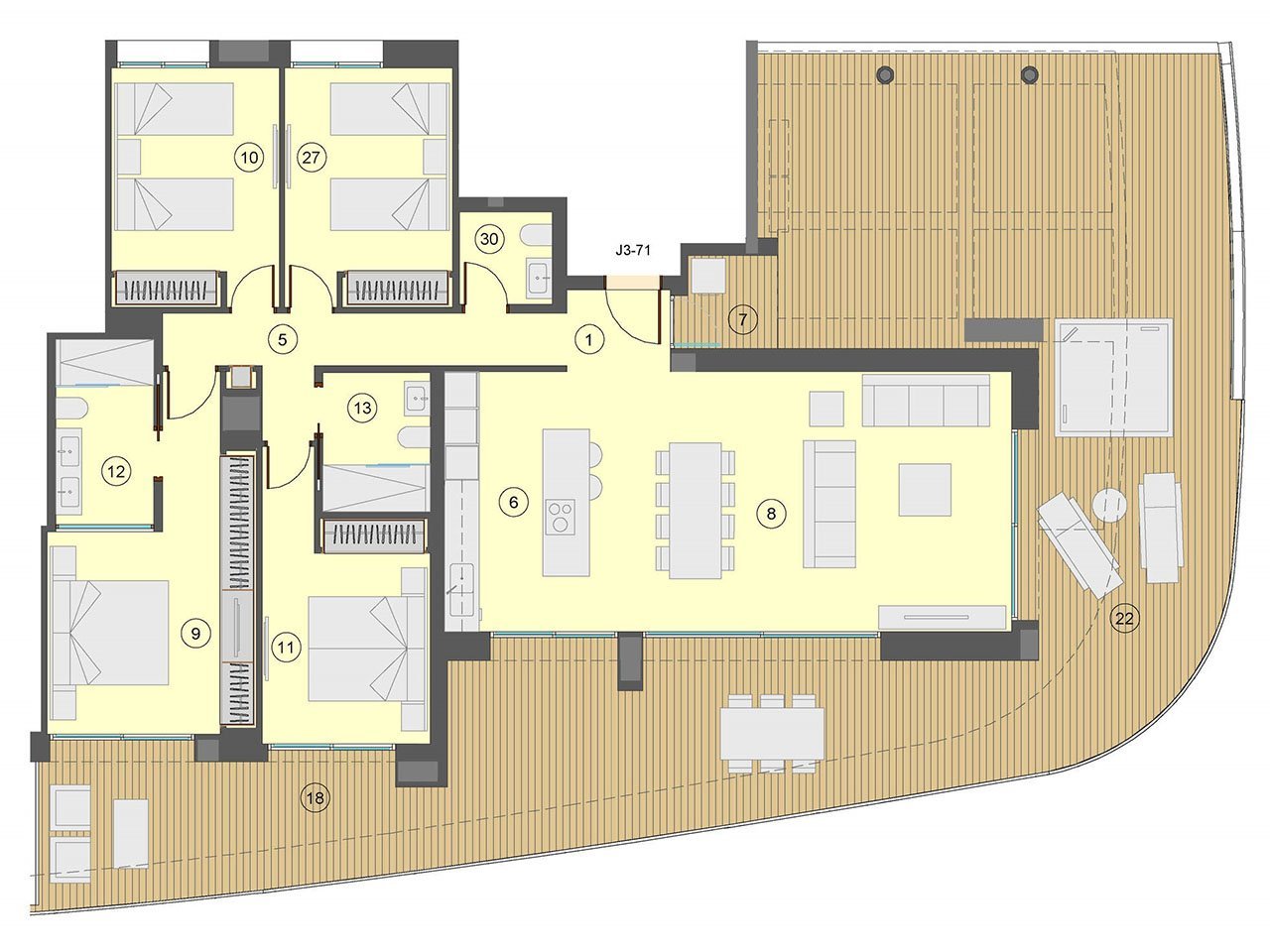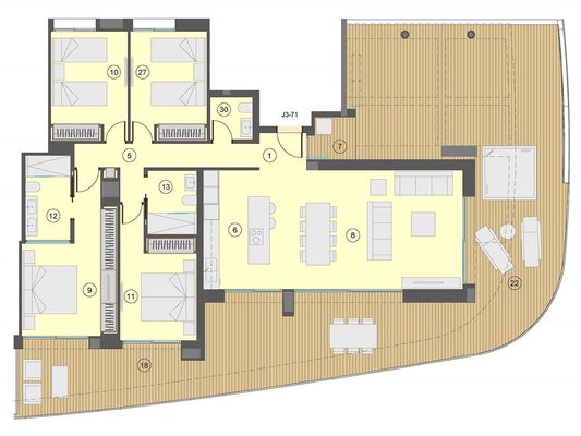 Diese wunderschönen Wohnungen, die alle einen phantastischen Meerblick bieten, verfügen über eine konstruierte Fläche von 198 m² - 337 m² (verschiedene Modelle, inklusive Terrassen) mit
