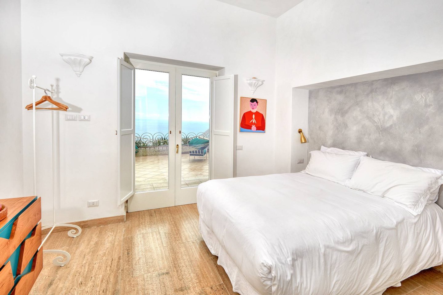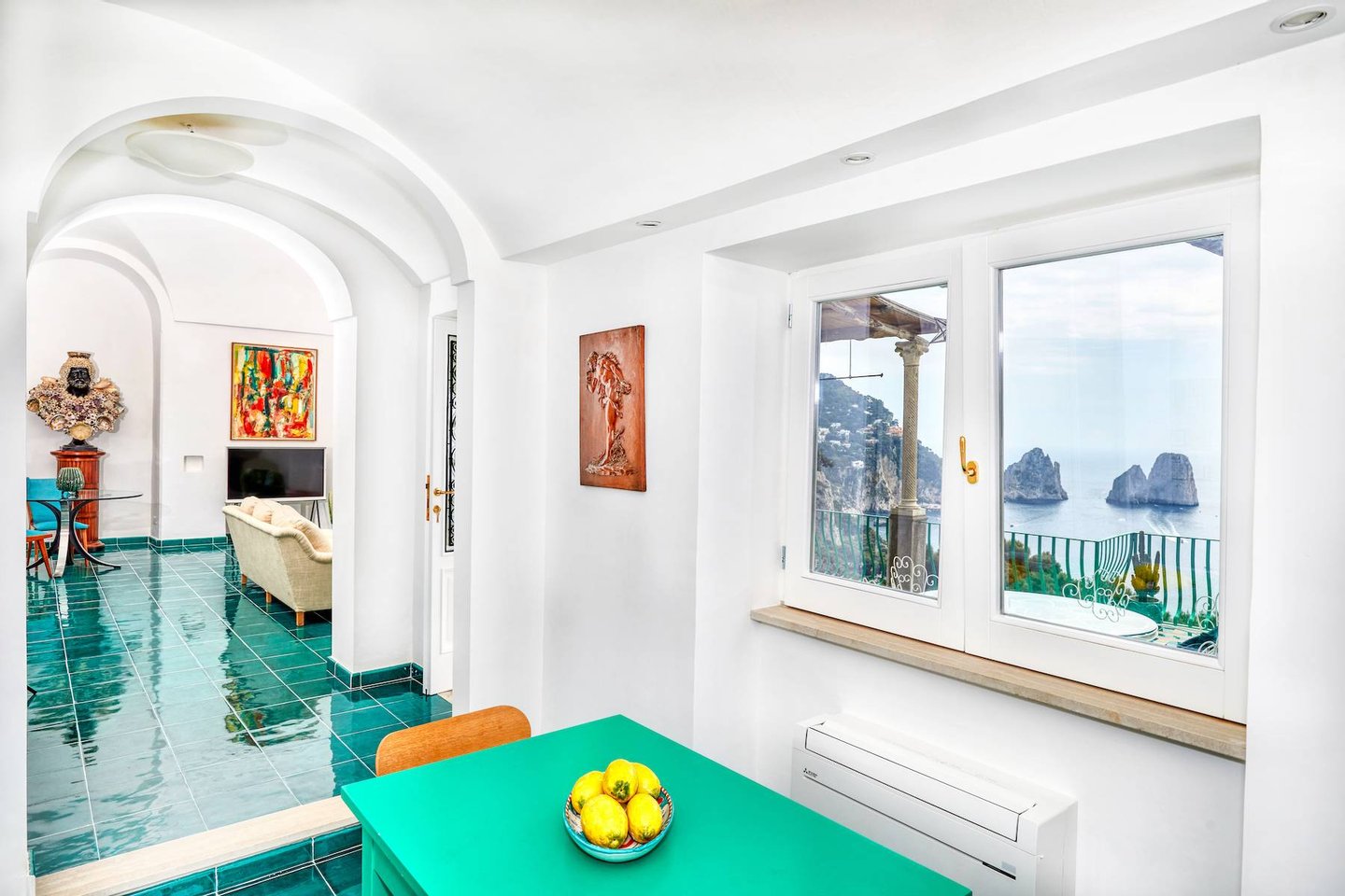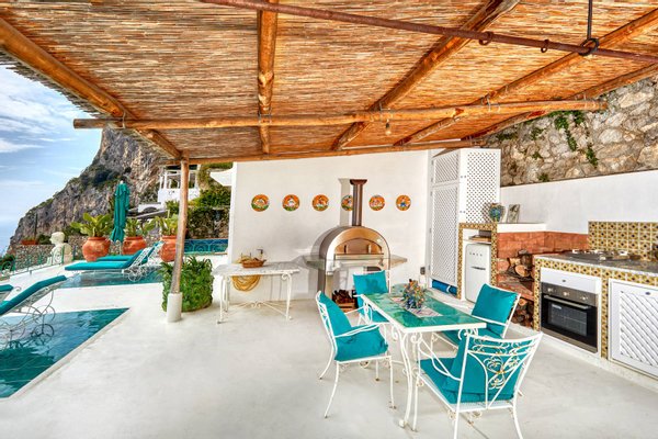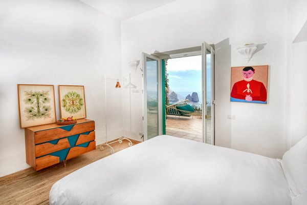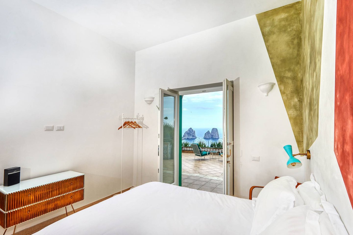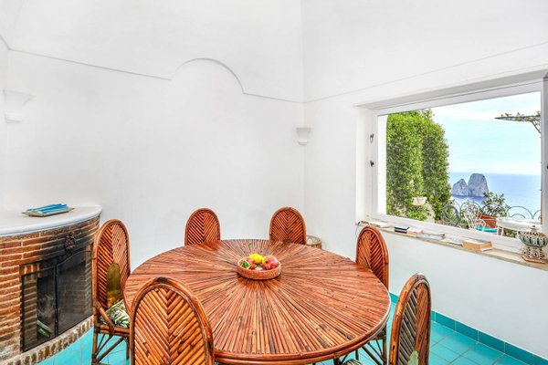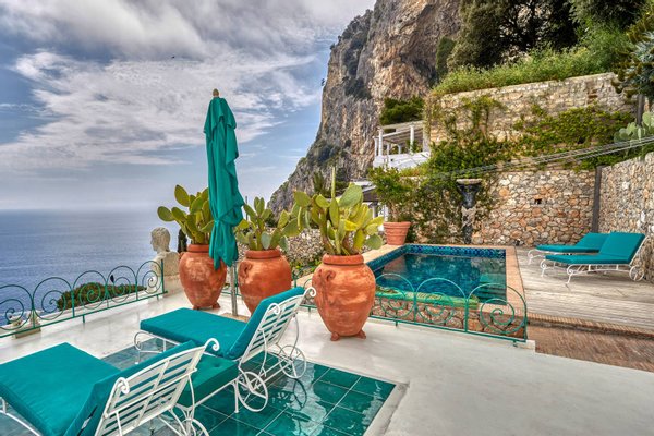 Guests of the villa will mostly spend the day on the large outside terraces, in the small shaded garden and in the pool, as the view is breathtaking, a real postcard with the famous Faraglioni in the background. There are plenty of tables, chairs, lounge chairs and sofas to eat, read, debate, dream and sleep. The pool disinfection system is salt-based, chlorine free. Staff comes twice a week in the early morning to discretely clean and maintain.