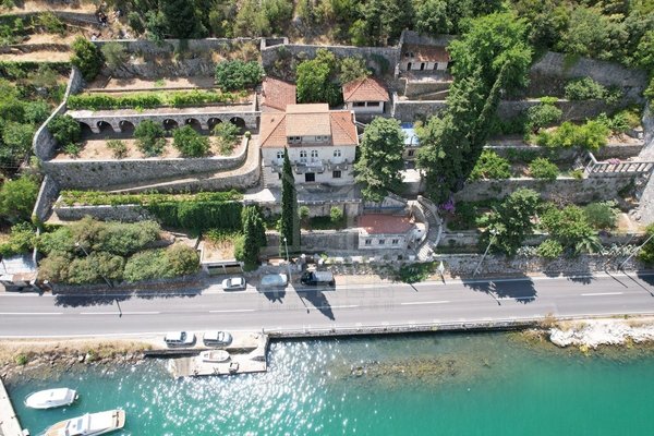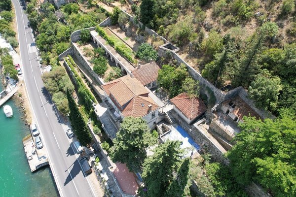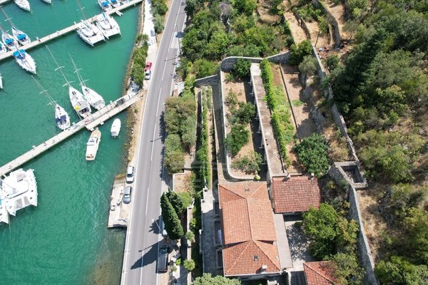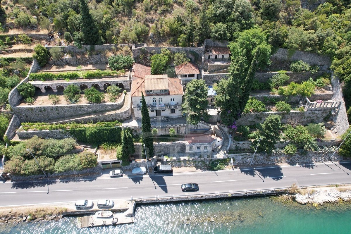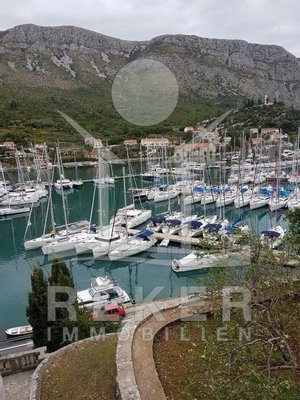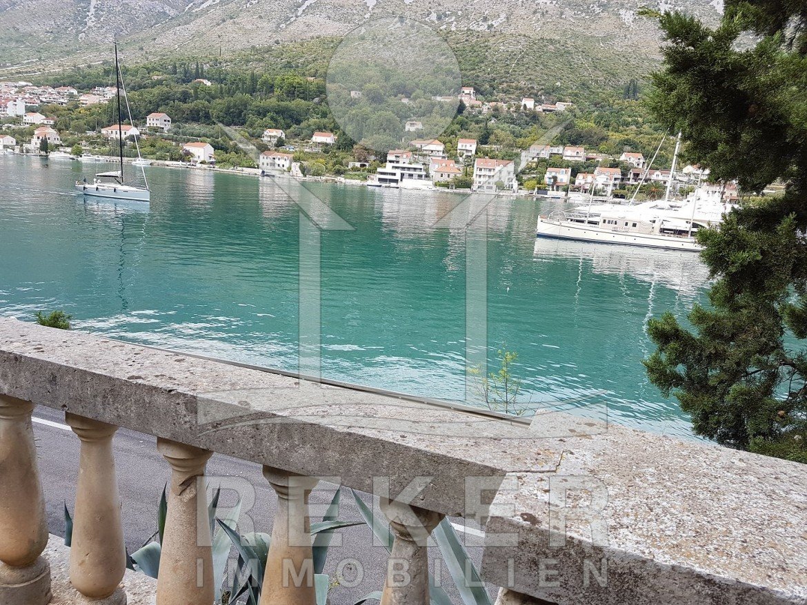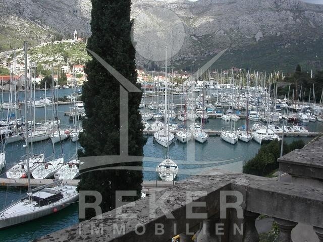 Zwischen Wasser und grünem Hang zieht sich diese stattliche Villa mit weitem Blick auf die Marina Dubrovnik direkt entlang der Küstenstraße von Komolac. Die erste Reihe zum Meer ist hier nicht nur ein Versprechen – sie ist Realität. Vom privaten Uferbereich bis zur oberhalb thronenden Villa erstreckt sich das Anwesen terrassenförmig in den Hang. Die Umgebung ist ruhig, durchgrünt und geprägt von historischen Steinmauern und altem Baumbestand. Wer mit dem Boot kommt, findet Ankerplatz und sichere Garage – beides gleich vor der Haustür.