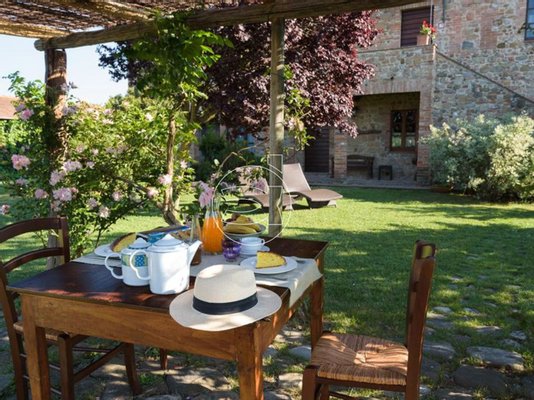 Das Objekt, eingebettet in einen großen Garten mit Rosen, duftendem Lavendel, Olivenbäumen und hohen Zypressen, besticht durch seine schlichte und beruhigende mittelalterliche Schönheit, aus der die gesamte Struktur stammt, typisch für die Häuser in Bagno Vignoni, Rocca d'Orcia, San Quirico und Radicofani.