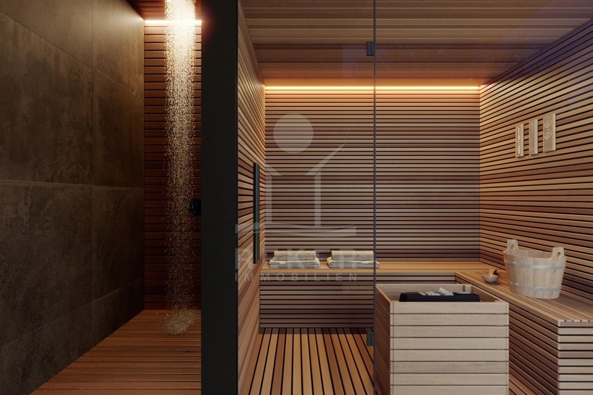 Der Garten: gepflegt, durchdacht, privat. Der beheizbare Salzwasserpool liegt perfekt in der Sonne. Drumherum: eine schöne Terrasse, Liegestühle, Designer-Möbel, Außendusche. Die automatische Bewässerung übernimmt die Pflege, die Steinmauer sorgt für Ruhe. Wer’s ruhig mag, kann einfach abschalten. Wer Gäste hat, wird es schätzen, wie alles sofort funktioniert.