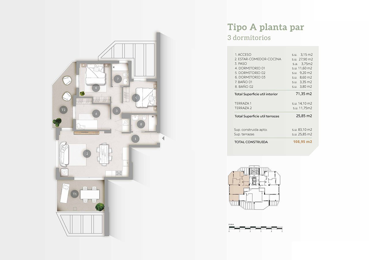 Die hochwertige Ausstattung der Wohnungen beinhaltet PVC- oder Aluminiumfenster mit Doppelverglasung und elektrischen Rollläden, Sicherheitstüren, Einbauküchen mit Ober- und Unterschränken, Backofen, Induktionskochfeld, Dunstabzugshaube und Kühlschrank, Einbauschränke in den Schlafzimmern, Badezimmer mit Möbeln und Duschtrennwänden, Vorinstallation Klimaanlage, Videogegensprechanlage und eine aerothermische Anlage zur ökologischen Erzeugung von heißem Brauchwasser. Und zu jedem Appartement gehört ein Tiefgaragenstellplatz.