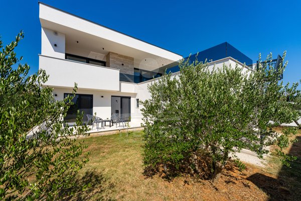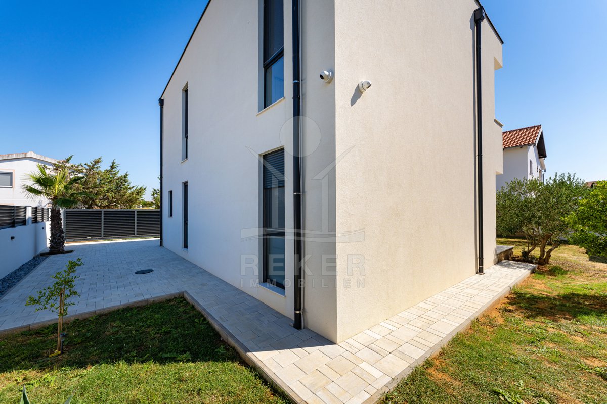 In einem kleinen Ort oberhalb der Küste, wartet diese moderne Villa auf Sie – zurückgezogen, aber nah am Meer. Keine Hotelburgen, keine Hektik. Nur ein paar Schritte durch ruhige Straßen – und schon sehen Sie das Meer. Die Villa steht auf einem Eckgrundstück mit Oliven, Palmen und viel Sonne. Die Einfahrt ist gepflastert, das Tor elektrisch. Der Garten ist gepflegt, eingezäunt und nicht einsehbar.