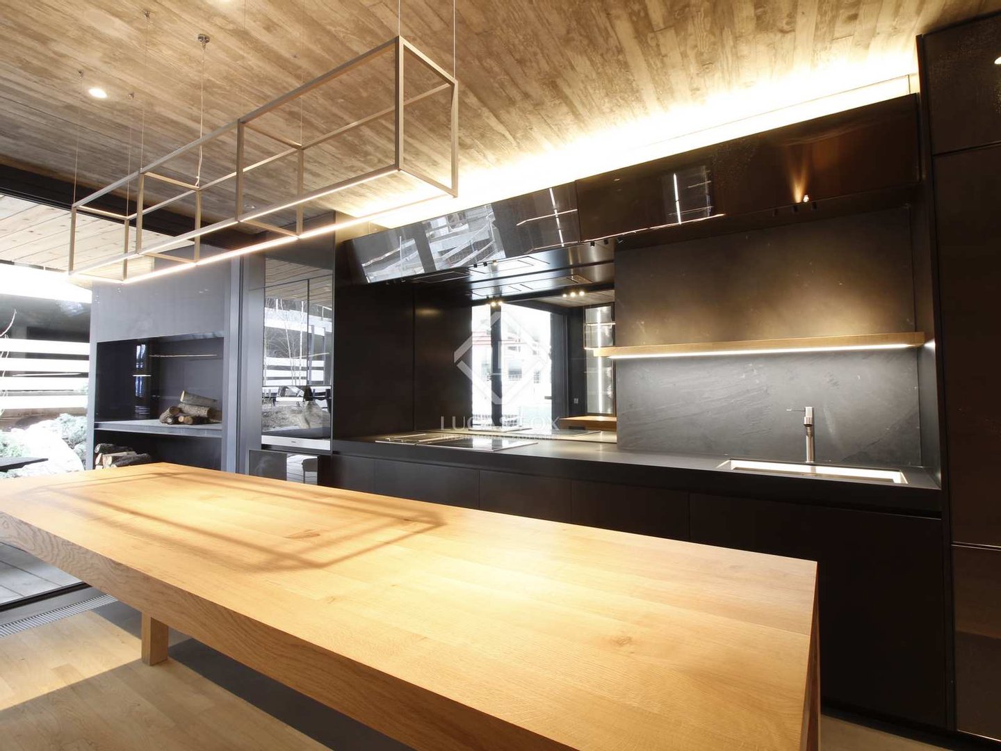 Im Inneren befindet sich ein Wohn-Esszimmer mit einem herrlichen Kamin, der Wärme in den Raum bringt, und mit großen Fenstern, die viel natürliches Licht hereinlassen und einen unglaublichen Blick auf die Berge bieten. Als nächstes wird die Küche vorgestellt, die komplett mit den besten Marken, integrierten Schränken und einem Massivholz-Arbeitstisch ausgestattet ist. Der Tagesbereich wird durch ein Gäste-WC vervollständigt.
