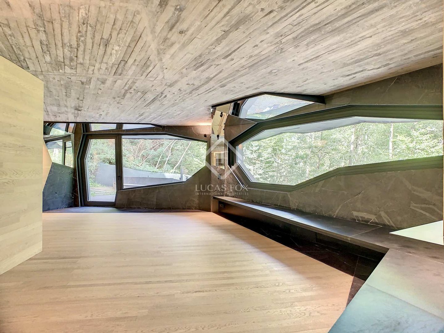 Es präsentiert ein einzigartiges zeitgenössisches Design mit einer natürlichen Schieferfassade mit unregelmäßigen Formen. Die Anlage fügt sich dank ihres Designs und der Verwendung natürlicher Materialien wie Schiefer, Holz, Stahl und Glas perfekt in die bergige Umgebung des Alpenwaldes ein.