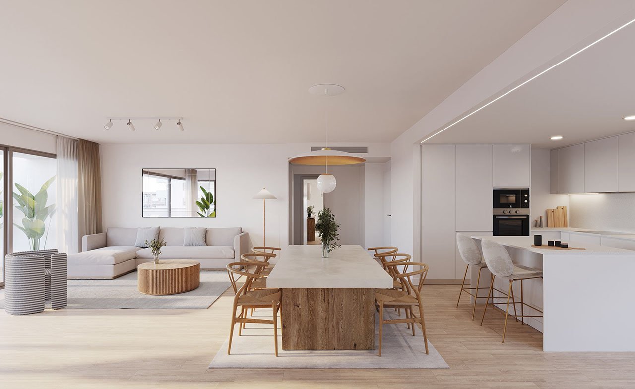 Die hochwertige Ausstattung dieser Wohnungen beinhaltet unter anderem Klimaanlage, Einbauküchen mit Dunstabzugshaube, Induktionsfeld, Backofen und Mikrowelle, Sicherheitstüren, Video-Gegensprechanlage, PVC- oder Aluminium-Fenster mit