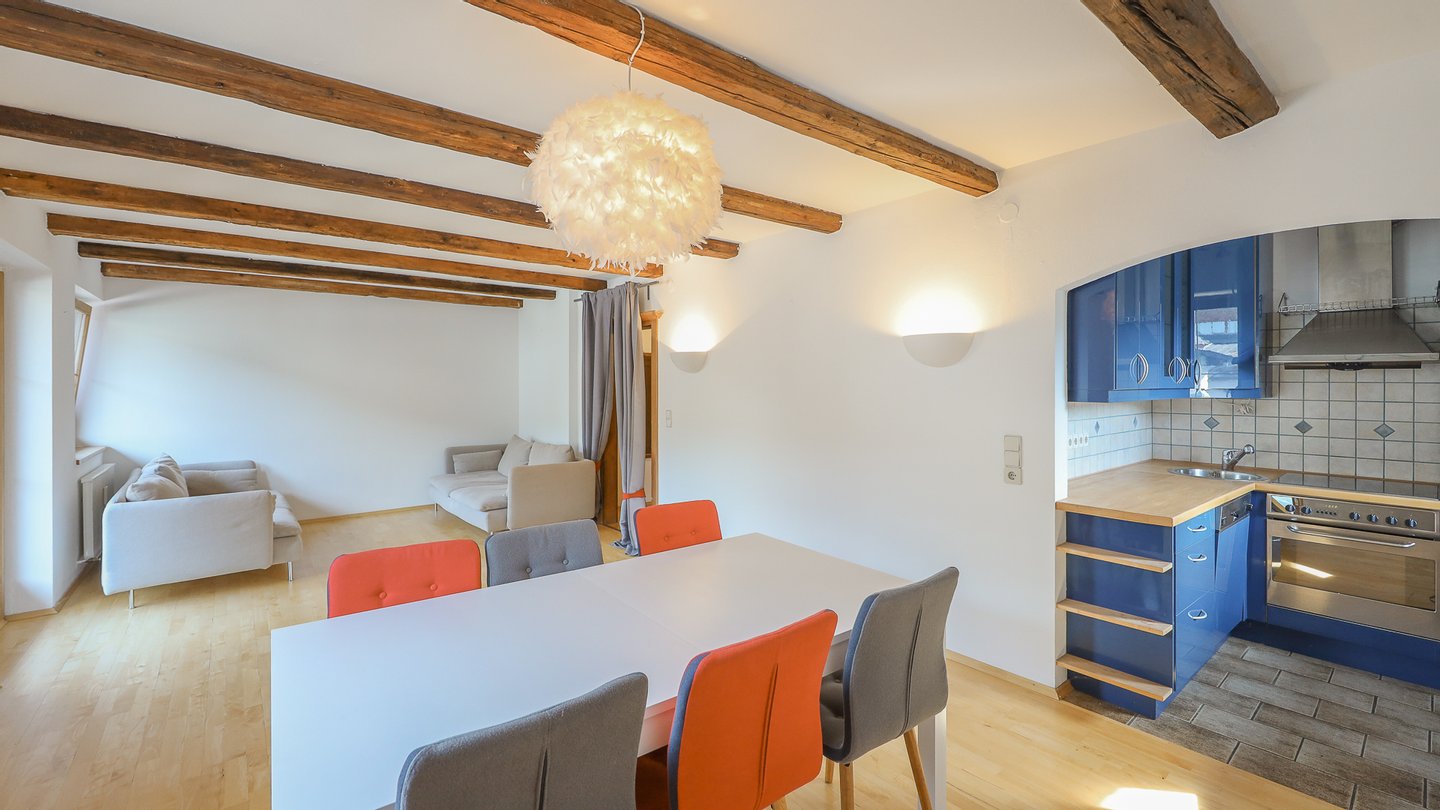 Die Wohnung besteht aus, großer Diele, Gäste-WC, schönem Wohnraum mit Deckenbalken und großem südwestseitigem Balkon, komplett eingerichteter und ausgestatteter Küche, 2 Schlafzimmern und einem Badezimmer.