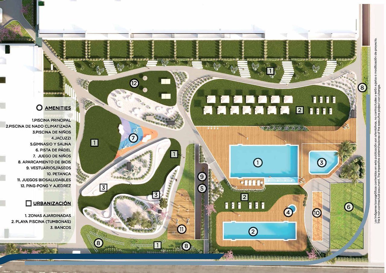 Die wunderschön gestalteten Gemeinschaftsanlagen umfassen: Schwimmbäder für Erwachsene und Kinder, einen Whirlpool, einen Kinderspielplatz, einen Fitnessraum, eine Sauna, einen Padel-Platz und diverse Gartenbereiche.