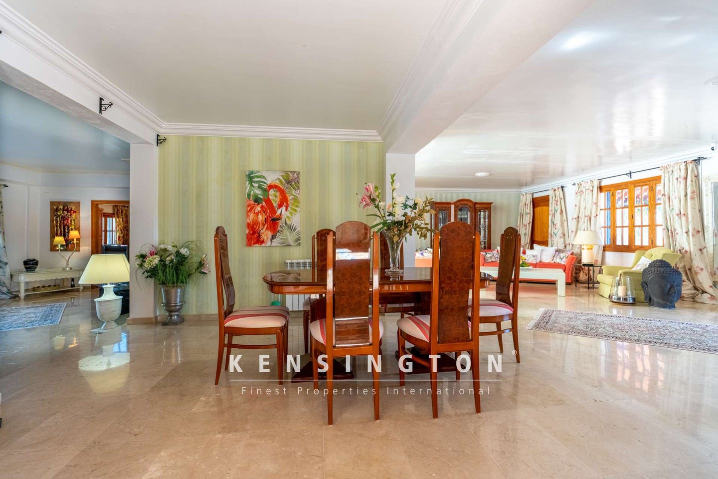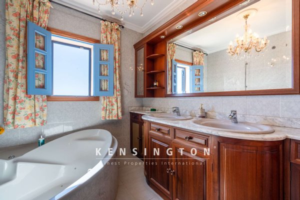 Man parkt das Auto unter dem Carport, welches Platz für zwei Autos bietet und betritt das Haus in einen Vorraum mit Kamin. Von diesem aus gelangt man direkt in den grossen Wohn- und Essbereich und in die voll ausgestattete Küche. Vom Erdgeschoss aus hat man Zugang auf die vorgelagerte Terrasse mit Sitzmöglichkeiten und den Poolbereich. Desweiteren befinden sich im Erdgeschoss ein Schlafzimmer mit Bad en suite sowie ein weiteres Badezimmer mit Badewanne. Eine elegante Marmor-Treppe führt hinauf in das Obergeschoss, was durch das grosse Panormafenster besonders hell ist. Hier befinden sich das Hauptschlafzimmer mit Bad en suite mit Badewanne sowie drei weitere Schlafzimmer und ein separates, erst kürzlich modernisiertes, Bad mit ebenerdiger Dusche.