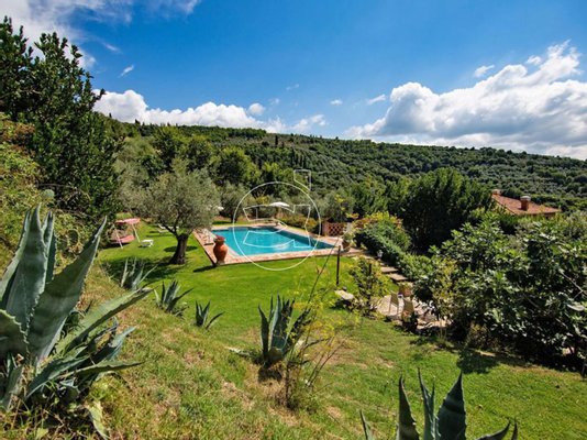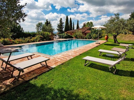 Ein Bauernhaus, dass sich harmonisch in die Hügel mit Weinbergen und Olivenhainen einfügt, die im Osten an das weite und fruchtbare Valdichiana grenzen.