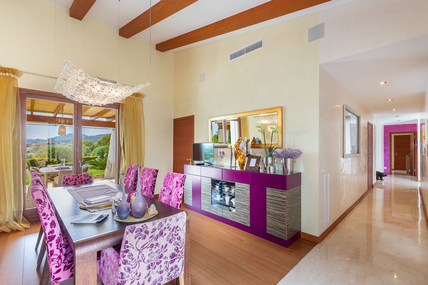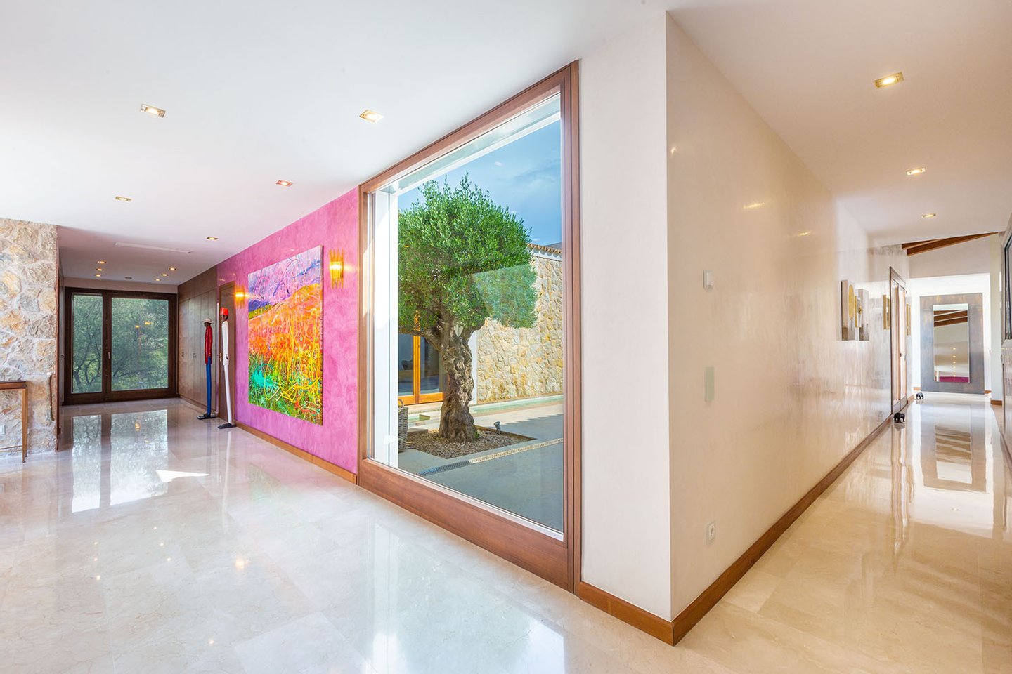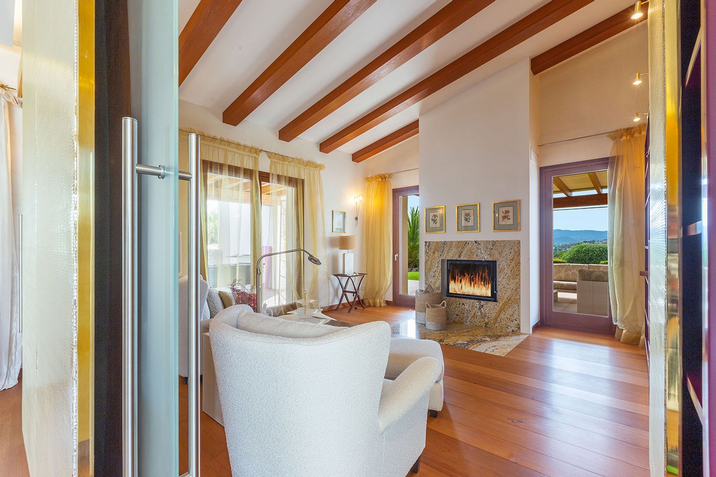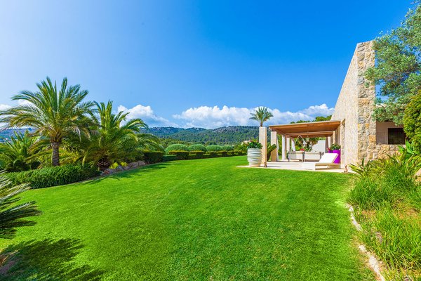 Diese Traumfinca befindet sich auf einem weitläufigen Kulturgrundstück am Rande des Dorfes Calvia, eingebettet in die traumhafte Kulisse des Tramuntana-Gebirges, und bietet absolute Privatsphäre und einen sensationellen Panoramablick auf das Dorf und die historische Kirche. In Haus-Nähe ist ein wunderbarer, sehr aufwendig gestalteter Garten mit Beleuchtung, großen Rasenflächen und einer schönen Poolterrasse angelegt. Die barrierefreie Finca beeindruckt mit einem interessanten Kontrast aus moderner Architektur und hochwertigen natürlichen Materialien. Ein luxuriöses, stylisches Innendesign sowie zeitgemäße Haus- und Sicherheitstechnik bieten höchsten Wohnkomfort. Sie ist mit der Wasserversorgung durch einen eigenen Brunnen und einer Fotovoltaik-Anlage vollkommen autark. Die Wohnfläche erstreckt sich über eine Etage und umfasst das Wohnzimmer mit Kamin und Zugang zu überdachten Terrassen und einem großen Patio mit Wasserfall, das Esszimmer, die Küche, eine Bibliothek, eine Gästetoilette und drei Schlafzimmer mit Bädern en suite, eines davon mit Ankleide und zwei mit einem kleinen Salon mit Küche. Hinzu kommt ein Mehrzweckraum, das als ein Büro oder ein weiteres Schlafzimmer genutzt werden könnte. Ein separat zugänglicher Raum mit Sauna könnte als 4. Schlafzimmer oder Fitness-Bereich gestaltet werden. Im Untergeschoss gibt es eine Garage für 4 PKW und einen Wirtschaftsraum sowie Technik- und Abstellräume.