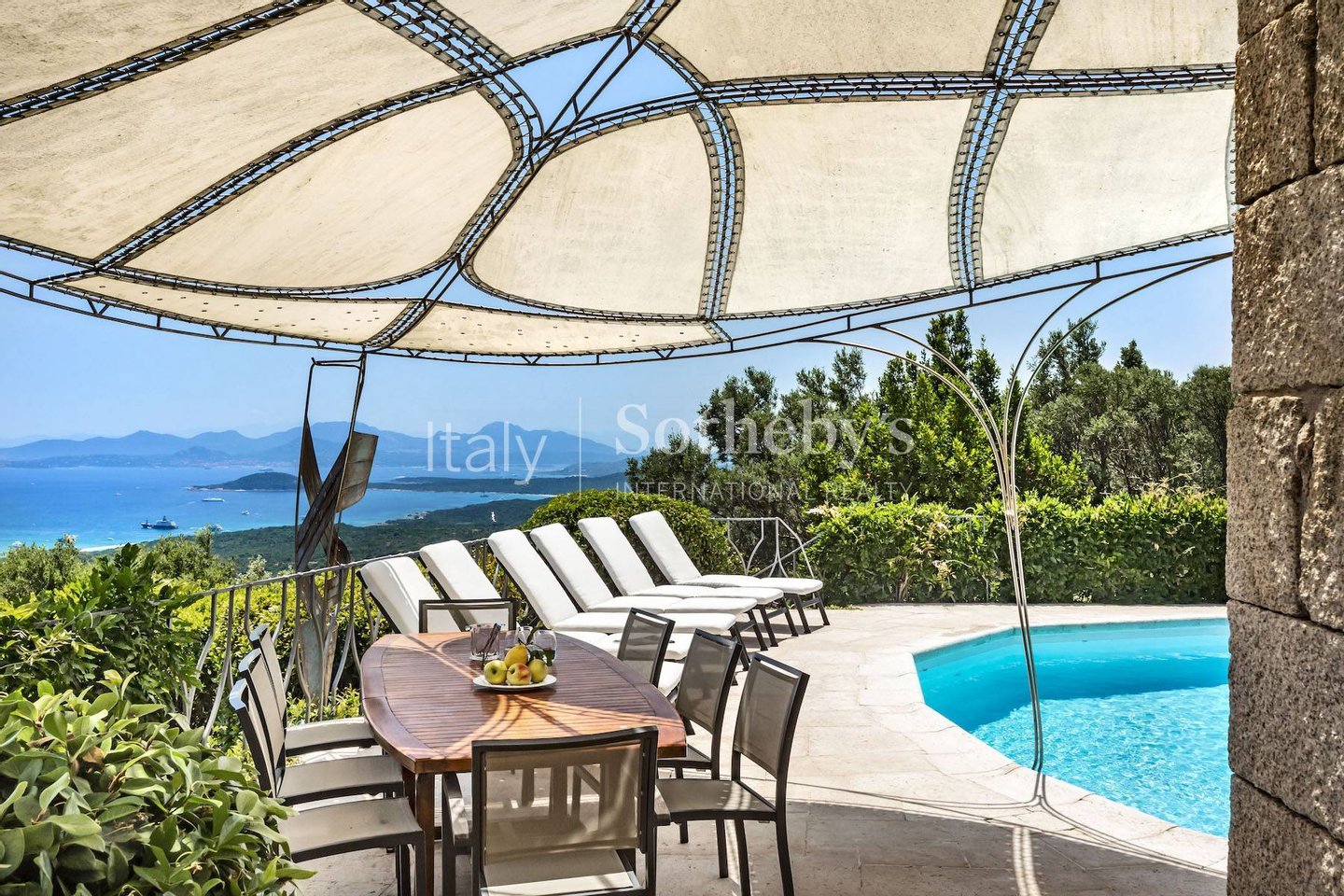 Der Poolbereich wurde mit einer spektakulären Überdachung versehen, die den Essbereich im Freien aufwertet und die Gäste vor der Sonne schützt.