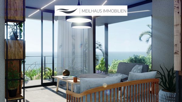 Eine Symbiose aus zwei Gebäuden, die in einer einzigartigen architektonischen Bauweise aus Glas, Beton, Stahl und Naturstein mit dem Meer & Himmel verschmelzen.