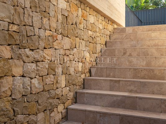 Nous soulignons son design unique et minimaliste utilisant des matériaux naturels tels que des murs en pierre naturelle, du marbre travertin, du bois et du béton apparent, entièrement intégrés dans le paysage.