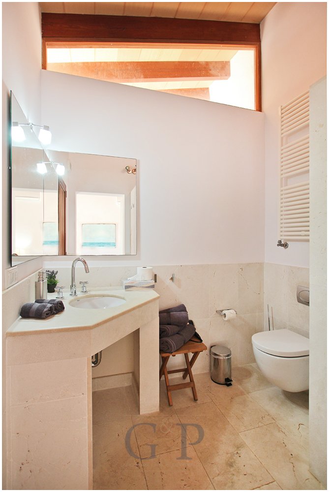 Die Treppe führt Sie in die erste Etage der Immobilie. Hier befindet sich das Hauptschlafzimmer mit Badezimmer en-suite und Ankleidebereich sowie mit Zugang zu zwei Balkonen, von denen Sie den Blick in den Garten und auf das Meer und vor allem auch auf das bekannt Kloster Sant Salvador genießen können.