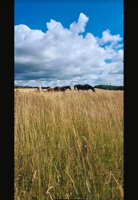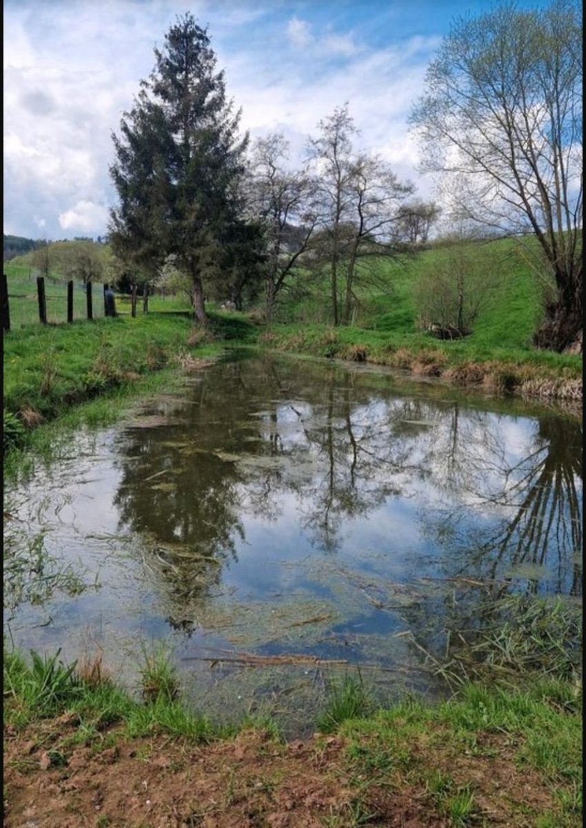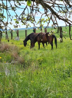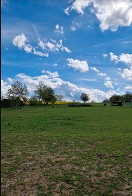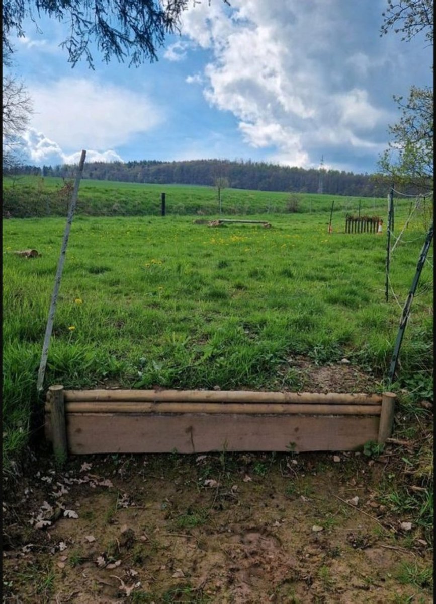 Die Teiche werden vom angrenzenden Bach gefüllt. Um immer Wasser zu gewähren befindet sich außerdem ein 31m! tiefer Brunnen auf dem Grundstück. Auf der Weide befindet sich derzeit noch ein kleiner Geländeplatz mit Naturhindernissen, auch hier ist ein weiterer Ausbau möglich.