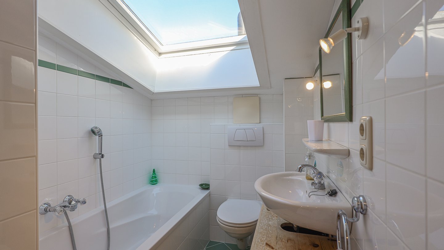Sie besteht aus Diele, sehr großem Wohnzimmer mit schöner Dachuntersicht und Balkon, 2 Schlafzimmern, 2 Badezimmern, kleinem Schrankraum, Küche und einem weiteren Notschlafzimmer.