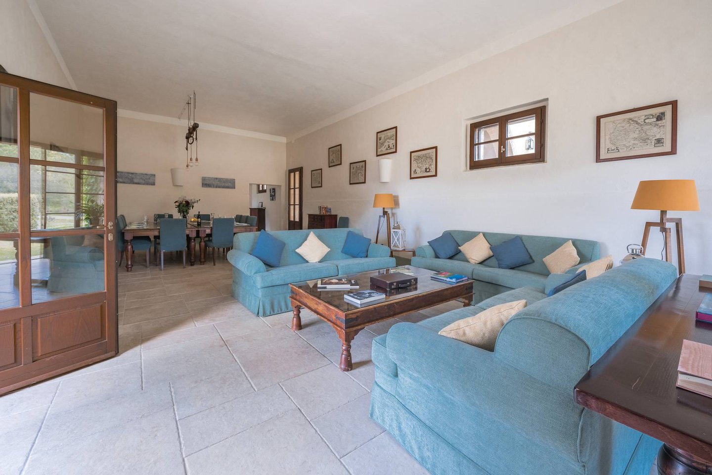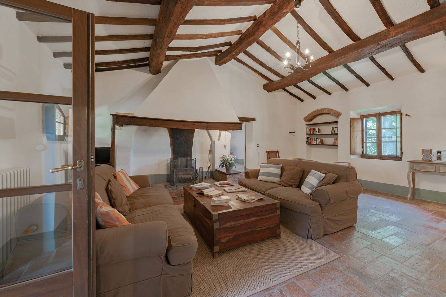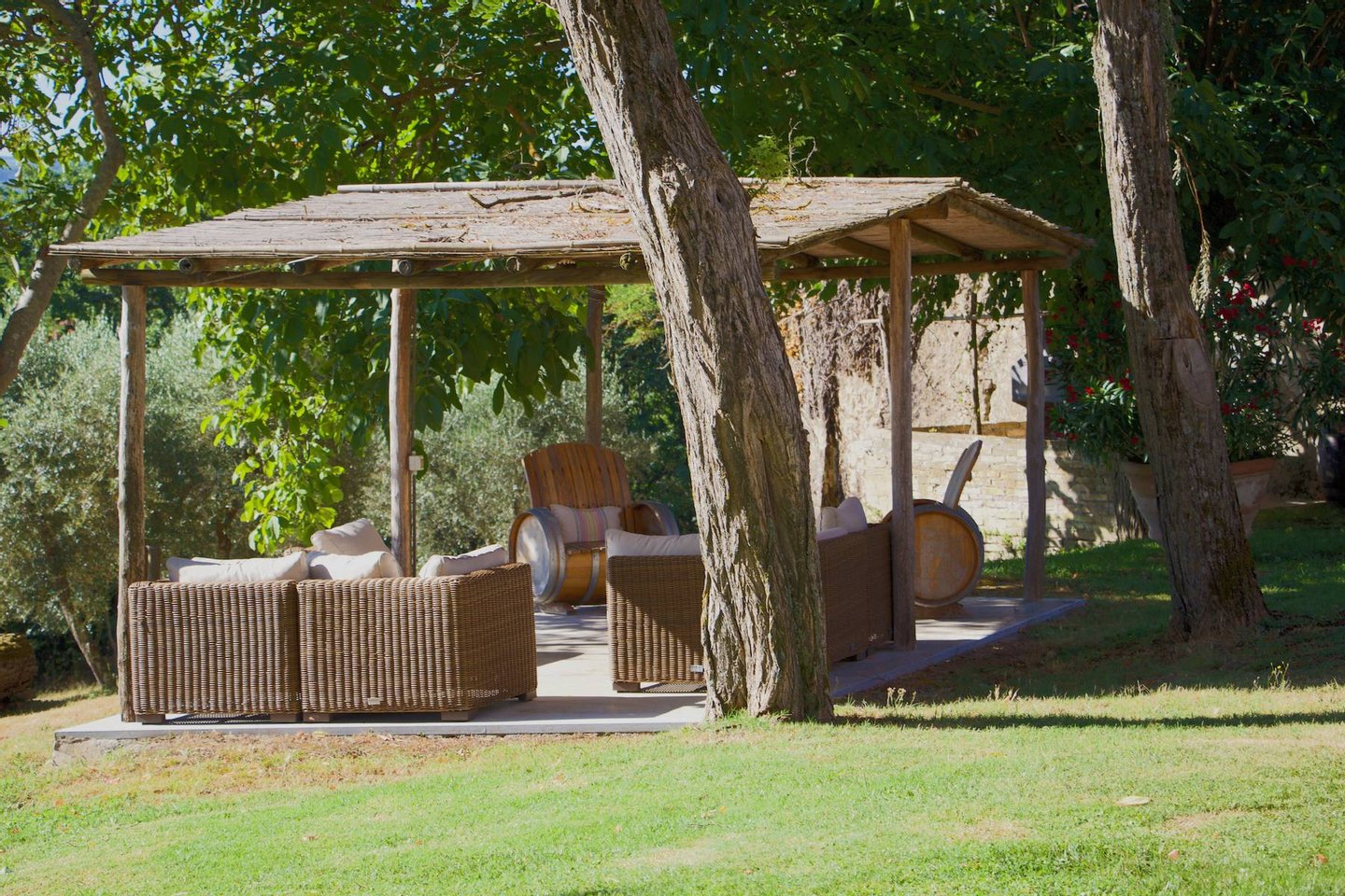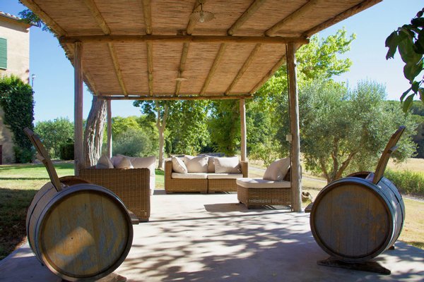 Large picture window doors open onto the garden where guests can enjoy an evening cocktail or read a book while looking out to an incomparable glimpse of Montalcino. A large covered patio, or pergola, is set up for dining enjoyment along with a wood barbecue area.
