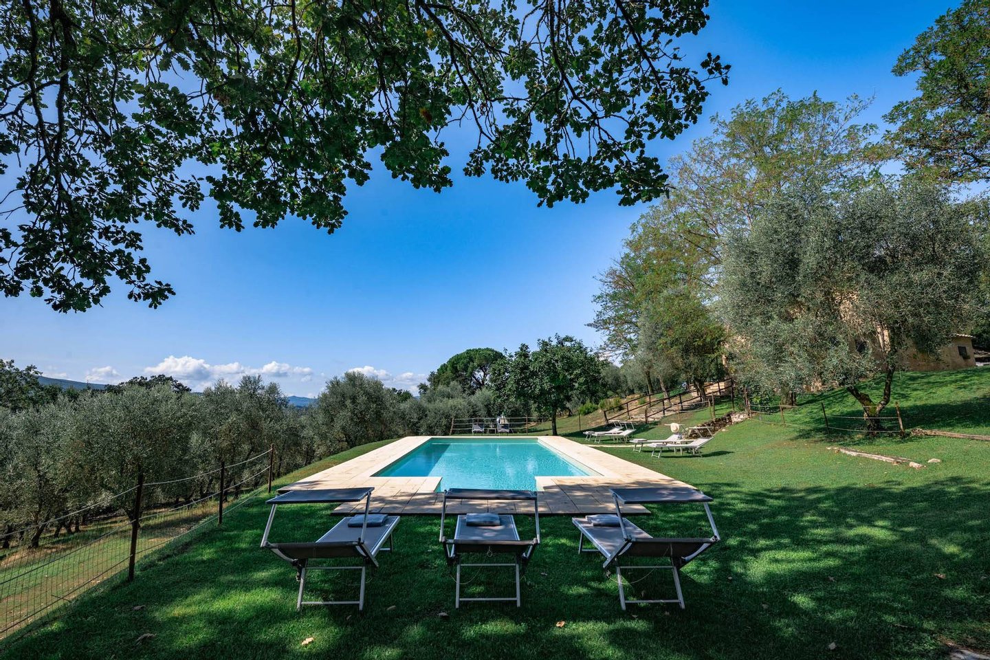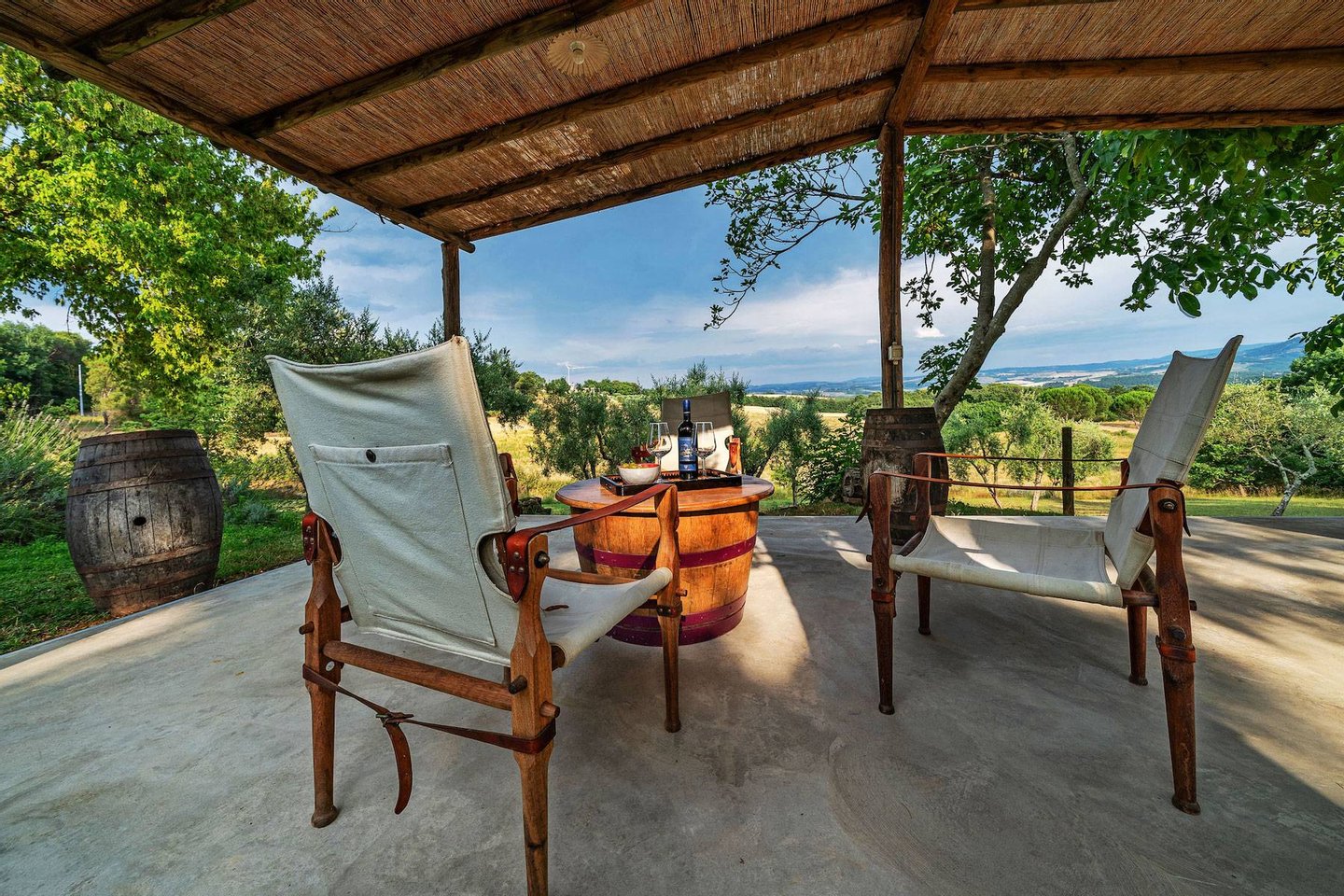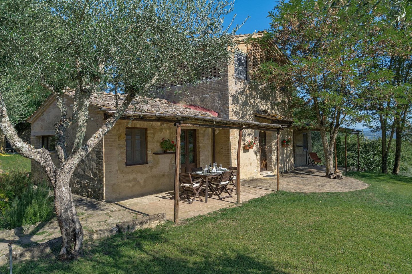 Large picture window doors open onto the garden where guests can enjoy an evening cocktail or read a book while looking out to an incomparable glimpse of Montalcino. A large covered patio, or pergola, is set up for dining enjoyment along with a wood barbecue area.