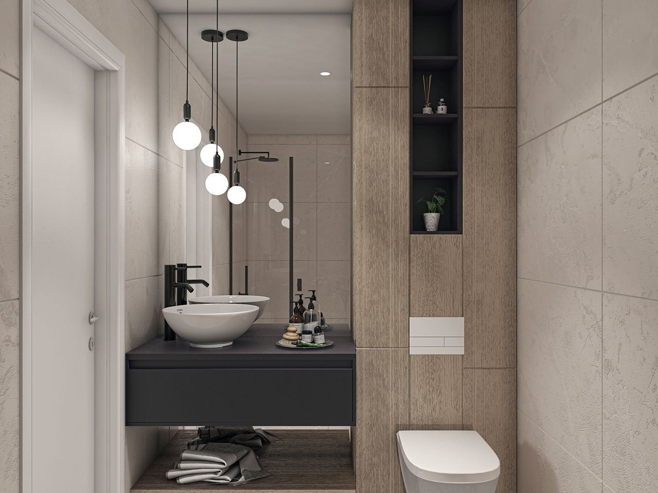 - Komplett ausgestattete Bäder mit Waschtisch, Spiegel und Duschabtrennung
