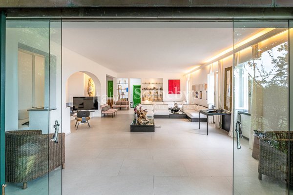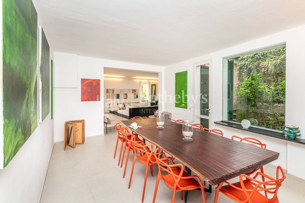 First floor: We are welcomed by a large and bright living room with white sofas and French windows that allow direct access to the outdoor patio. Next is a formal dining room with a wooden table for 10 people, and a fully equipped kitchen with fridge, oven, dishwasher and microwave.